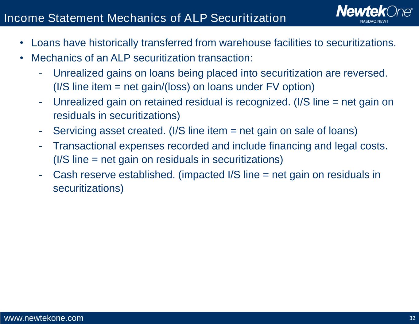 www.newtekone.com 32 Income Statement Mechanics of ALP Securitization • Loans have historically transferred from warehouse facilities to securitizations. • Mechanics of an ALP securitization transaction: - Unrealized gains on loans being placed into securitization are reversed. (I/S line item = net gain/(loss) on loans under FV option) - Unrealized gain on retained residual is recognized. (I/S line = net gain on residuals in securitizations) - Servicing asset created. (I/S line item = net gain on sale of loans) - Transactional expenses recorded and include financing and legal costs. (I/S line = net gain on residuals in securitizations) - Cash reserve established. (impacted I/S line = net gain on residuals in securitizations)