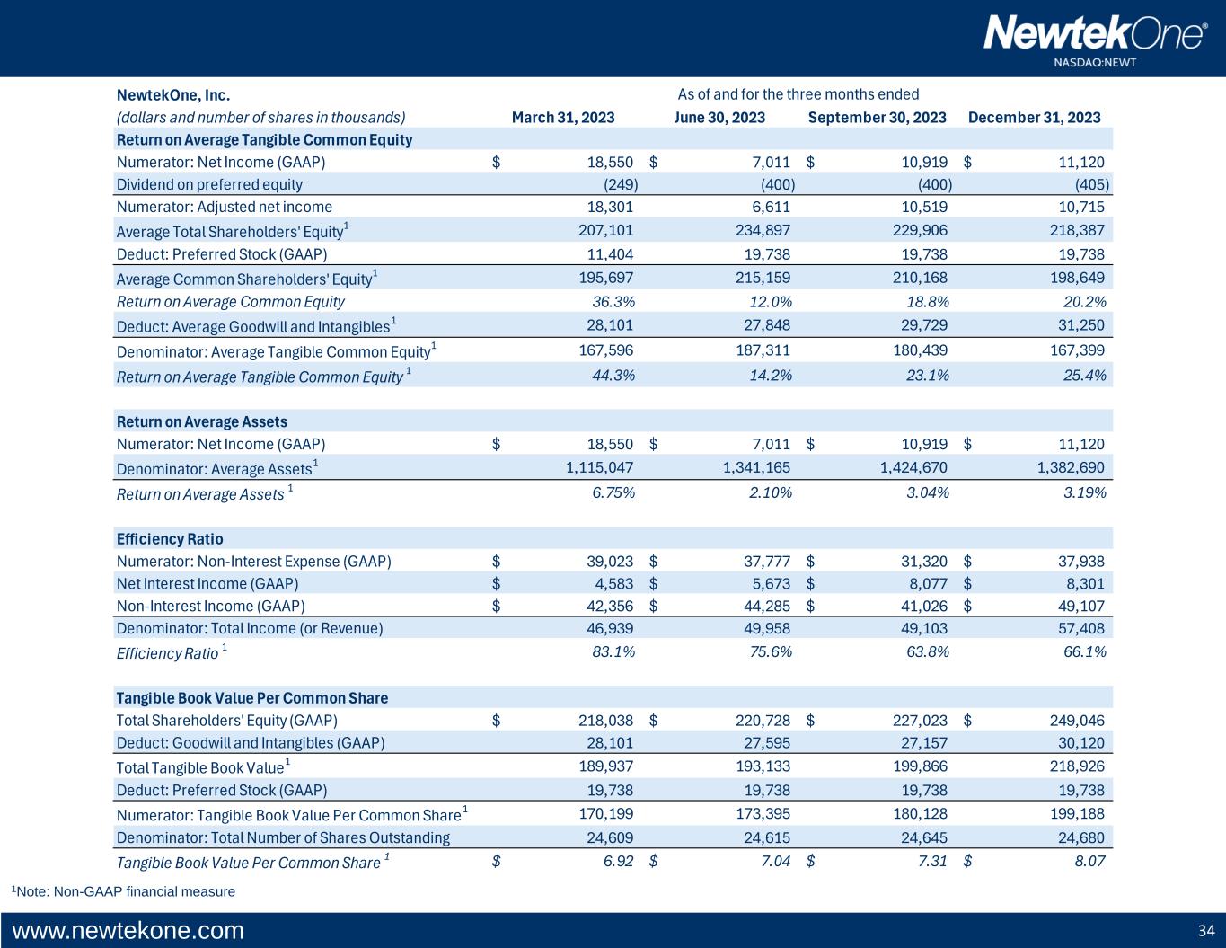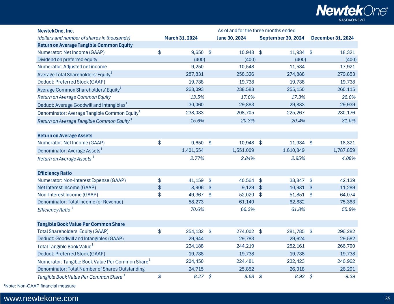 www.newtekone.com 34 1Note: Non-GAAP financial measure NewtekOne, Inc. (dollars and number of shares in thousands) March 31, 2023 June 30, 2023 September 30, 2023 December 31, 2023 Return on Average Tangible Common Equity Numerator: Net Income (GAAP) 18,550$ 7,011$ 10,919$ 11,120$ Dividend on preferred equity (249) (400) (400) (405) Numerator: Adjusted net income 18,301 6,611 10,519 10,715 Average Total Shareholders' Equity1 207,101 234,897 229,906 218,387 Deduct: Preferred Stock (GAAP) 11,404 19,738 19,738 19,738 Average Common Shareholders' Equity1 195,697 215,159 210,168 198,649 Return on Average Common Equity 36.3% 12.0% 18.8% 20.2% Deduct: Average Goodwill and Intangibles1 28,101 27,848 29,729 31,250 Denominator: Average Tangible Common Equity1 167,596 187,311 180,439 167,399 Return on Average Tangible Common Equity 1 44.3% 14.2% 23.1% 25.4% Return on Average Assets Numerator: Net Income (GAAP) 18,550$ 7,011$ 10,919$ 11,120$ Denominator: Average Assets1 1,115,047 1,341,165 1,424,670 1,382,690 Return on Average Assets 1 6.75% 2.10% 3.04% 3.19% Efficiency Ratio Numerator: Non-Interest Expense (GAAP) 39,023$ 37,777$ 31,320$ 37,938$ Net Interest Income (GAAP) 4,583$ 5,673$ 8,077$ 8,301$ Non-Interest Income (GAAP) 42,356$ 44,285$ 41,026$ 49,107$ Denominator: Total Income (or Revenue) 46,939 49,958 49,103 57,408 Efficiency Ratio 1 83.1% 75.6% 63.8% 66.1% Tangible Book Value Per Common Share Total Shareholders' Equity (GAAP) 218,038$ 220,728$ 227,023$ 249,046$ Deduct: Goodwill and Intangibles (GAAP) 28,101 27,595 27,157 30,120 Total Tangible Book Value1 189,937 193,133 199,866 218,926 Deduct: Preferred Stock (GAAP) 19,738 19,738 19,738 19,738 Numerator: Tangible Book Value Per Common Share1 170,199 173,395 180,128 199,188 Denominator: Total Number of Shares Outstanding 24,609 24,615 24,645 24,680 Tangible Book Value Per Common Share 1 6.92$ 7.04$ 7.31$ 8.07$ As of and for the three months ended