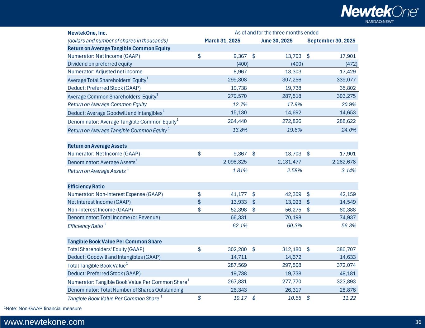 www.newtekone.com 35 1Note: Non-GAAP financial measure NewtekOne, Inc. (dollars and number of shares in thousands) March 31, 2024 June 30, 2024 September 30, 2024 December 31, 2024 Return on Average Tangible Common Equity Numerator: Net Income (GAAP) 9,650$ 10,948$ 11,934$ 18,321$ Dividend on preferred equity (400) (400) (400) (400) Numerator: Adjusted net income 9,250 10,548 11,534 17,921 Average Total Shareholders' Equity1 287,831 258,326 274,888 279,853 Deduct: Preferred Stock (GAAP) 19,738 19,738 19,738 19,738 Average Common Shareholders' Equity1 268,093 238,588 255,150 260,115 Return on Average Common Equity 13.5% 17.0% 17.3% 26.0% Deduct: Average Goodwill and Intangibles1 30,060 29,883 29,883 29,939 Denominator: Average Tangible Common Equity1 238,033 208,705 225,267 230,176 Return on Average Tangible Common Equity 1 15.6% 20.3% 20.4% 31.0% Return on Average Assets Numerator: Net Income (GAAP) 9,650$ 10,948$ 11,934$ 18,321$ Denominator: Average Assets1 1,401,554 1,551,009 1,610,849 1,787,859 Return on Average Assets 1 2.77% 2.84% 2.95% 4.08% Efficiency Ratio Numerator: Non-Interest Expense (GAAP) 41,159$ 40,564$ 38,847$ 42,139$ Net Interest Income (GAAP) 8,906$ 9,129$ 10,981$ 11,289$ Non-Interest Income (GAAP) 49,367$ 52,020$ 51,851$ 64,074$ Denominator: Total Income (or Revenue) 58,273 61,149 62,832 75,363 Efficiency Ratio 1 70.6% 66.3% 61.8% 55.9% Tangible Book Value Per Common Share Total Shareholders' Equity (GAAP) 254,132$ 274,002$ 281,785$ 296,282$ Deduct: Goodwill and Intangibles (GAAP) 29,944 29,783 29,624 29,582 Total Tangible Book Value1 224,188 244,219 252,161 266,700 Deduct: Preferred Stock (GAAP) 19,738 19,738 19,738 19,738 Numerator: Tangible Book Value Per Common Share1 204,450 224,481 232,423 246,962 Denominator: Total Number of Shares Outstanding 24,715 25,852 26,018 26,291 Tangible Book Value Per Common Share 1 8.27$ 8.68$ 8.93$ 9.39$ As of and for the three months ended