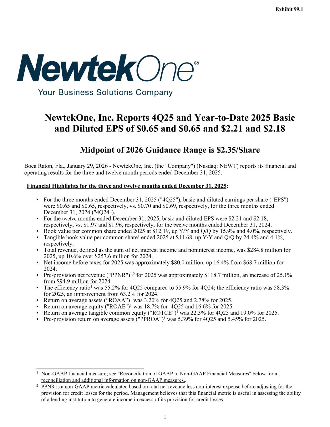 NewtekOne, Inc. Reports 4Q25 and Year-to-Date 2025 Basic and Diluted EPS of $0.65 and $0.65 and $2.21 and $2.18 Midpoint of 2026 Guidance Range is $2.35/Share Boca Raton, Fla., January 29, 2026 - NewtekOne, Inc. (the "Company") (Nasdaq: NEWT) reports its financial and operating results for the three and twelve month periods ended December 31, 2025. Financial Highlights for the three and twelve months ended December 31, 2025: • For the three months ended December 31, 2025 ("4Q25"), basic and diluted earnings per share ("EPS") were $0.65 and $0.65, respectively, vs. $0.70 and $0.69, respectively, for the three months ended December 31, 2024 ("4Q24"). • For the twelve months ended December 31, 2025, basic and diluted EPS were $2.21 and $2.18, respectively, vs. $1.97 and $1.96, respectively, for the twelve months ended December 31, 2024. • Book value per common share ended 2025 at $12.19, up Y/Y and Q/Q by 15.9% and 4.0%, respectively. • Tangible book value per common share1 ended 2025 at $11.68, up Y/Y and Q/Q by 24.4% and 4.1%, respectively. • Total revenue, defined as the sum of net interest income and noninterest income, was $284.8 million for 2025, up 10.6% over $257.6 million for 2024. • Net income before taxes for 2025 was approximately $80.0 million, up 16.4% from $68.7 million for 2024. • Pre-provision net revenue ("PPNR")1,2 for 2025 was approximately $118.7 million, an increase of 25.1% from $94.9 million for 2024. • The efficiency ratio1 was 55.2% for 4Q25 compared to 55.9% for 4Q24; the efficiency ratio was 58.3% for 2025, an improvement from 63.2% for 2024. • Return on average assets (“ROAA”)1 was 3.20% for 4Q25 and 2.78% for 2025. • Return on average equity ("ROAE")1 was 18.7% for 4Q25 and 16.6% for 2025. • Return on average tangible common equity (“ROTCE”)1 was 22.3% for 4Q25 and 19.0% for 2025. • Pre-provision return on average assets ("PPROA")1 was 5.39% for 4Q25 and 5.45% for 2025. Exhibit 99.1 1 1 Non-GAAP financial measure; see "Reconciliation of GAAP to Non-GAAP Financial Measures" below for a reconciliation and additional information on non-GAAP measures.. 2 PPNR is a non-GAAP metric calculated based on total net revenue less non-interest expense before adjusting for the provision for credit losses for the period. Management believes that this financial metric is useful in assessing the ability of a lending institution to generate income in excess of its provision for credit losses.