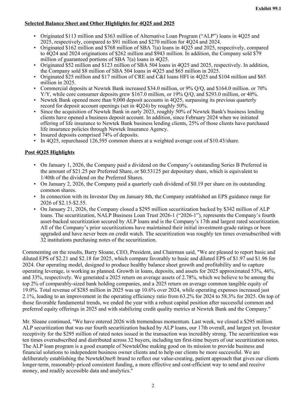 Selected Balance Sheet and Other Highlights for 4Q25 and 2025 • Originated $113 million and $363 million of Alternative Loan Program (“ALP”) loans in 4Q25 and 2025, respectively, compared to $91 million and $270 million for 4Q24 and 2024. • Originated $162 million and $768 million of SBA 7(a) loans in 4Q25 and 2025, respectively, compared to 4Q24 and 2024 originations of $262 million and $943 million. In addition, the Company sold $79 million of guaranteed portions of SBA 7(a) loans in 4Q25. • Originated $52 million and $123 million of SBA 504 loans in 4Q25 and 2025, respectively. In addition, the Company sold $8 million of SBA 504 loans in 4Q25 and $65 million in 2025. • Originated $25 million and $17 million of CRE and C&I loans HFI in 4Q25 and $104 million and $65 million in 2025. • Commercial deposits at Newtek Bank increased $34.0 million, or 9% Q/Q, and $164.0 million. or 70% Y/Y, while core consumer deposits grew $167.0 million, or 19% Q/Q, and $293.0 million, or 40%. • Newtek Bank opened more than 9,000 deposit accounts in 4Q25, surpassing its previous quarterly record for deposit account openings (set in 4Q24) by roughly 50%. • Since the acquisition of Newtek Bank in early 2023, roughly 50% of Newtek Bank's business lending clients have opened a business deposit account. In addition, since February 2024 when we initiated offering of life insurance to Newtek Bank business lending clients, 25% of those clients have purchased life insurance policies through Newtek Insurance Agency. • Insured deposits comprised 74% of deposits. • In 4Q25, repurchased 126,595 common shares at a weighted average cost of $10.43/share. Post 4Q25 Highlights • On January 1, 2026, the Company paid a dividend on the Company’s outstanding Series B Preferred in the amount of $21.25 per Preferred Share, or $0.53125 per depositary share, which is equivalent to 1/40th of the dividend on the Preferred Shares. • On January 2, 2026, the Company paid a quarterly cash dividend of $0.19 per share on its outstanding common shares. • In connection with its Investor Day on January 8th, the Company established an EPS guidance range for 2026 of $2.15-$2.55. • On January 21, 2026, the Company closed a $295 million securitization backed by $342 million of ALP loans. The securitization, NALP Business Loan Trust 2026-1 (“2026-1”), represents the Company’s fourth asset-backed securitization secured by ALP loans and is the Company’s 17th and largest rated securitization. All of the Company’s prior securitizations have maintained their initial investment-grade ratings or been upgraded and have never been on credit watch. The securitization was roughly ten times oversubscribed with 32 institutions purchasing notes of the securitization. Commenting on the results, Barry Sloane, CEO, President, and Chairman said, "We are pleased to report basic and diluted EPS of $2.21 and $2.18 for 2025, which compare favorably to basic and diluted EPS of $1.97 and $1.96 for 2024. Our operating model, designed to produce healthy balance sheet growth and profitability and to capture operating leverage, is working as planned. Growth in loans, deposits, and assets for 2025 approximated 53%, 46%, and 33%, respectively. We generated a 2025 return on average assets of 2.78%, which we believe to be among the top 2% of comparably-sized bank holding companies, and a 2025 return on average common tangible equity of 19.0%. Total revenue of $285 million in 2025 was up 10.6% over 2024, while operating expenses increased just 2.1%, leading to an improvement in the operating efficiency ratio from 63.2% for 2024 to 58.3% for 2025. On top of those favorable fundamental trends, we ended the year with a robust capital position after successful common and preferred equity offerings in 2025 and with stabilizing credit quality metrics at Newtek Bank and the Company." Mr. Sloane continued, "We have entered 2026 with tremendous momentum. Last week, we closed a $295 million ALP securitization that was our fourth securitization backed by ALP loans, our 17th overall, and largest yet. Investor receptivity for the $295 million of rated notes issued in the transaction was incredibly strong. The securitization was ten times oversubscribed and distributed across 32 buyers, including ten first-time buyers of our securitization notes. The ALP loan program is a good example of NewtekOne making good on its mission to provide business and financial solutions to independent business owner clients and to help our clients be more successful. We are deliberately establishing the NewtekOne® brand to reflect our value-creating, patient approach that gives our clients longer-term, reasonably-priced consistent funding, a more effective and cost-efficient way to send and receive money, and readily accessible data and analytics." Exhibit 99.1 2