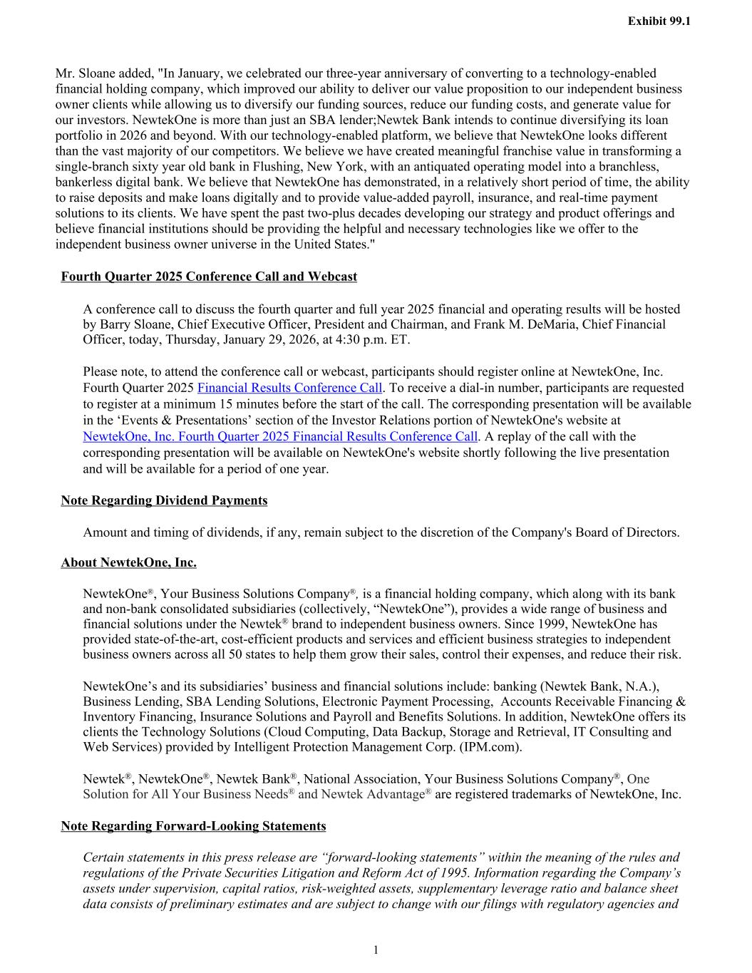 Mr. Sloane added, "In January, we celebrated our three-year anniversary of converting to a technology-enabled financial holding company, which improved our ability to deliver our value proposition to our independent business owner clients while allowing us to diversify our funding sources, reduce our funding costs, and generate value for our investors. NewtekOne is more than just an SBA lender;Newtek Bank intends to continue diversifying its loan portfolio in 2026 and beyond. With our technology-enabled platform, we believe that NewtekOne looks different than the vast majority of our competitors. We believe we have created meaningful franchise value in transforming a single-branch sixty year old bank in Flushing, New York, with an antiquated operating model into a branchless, bankerless digital bank. We believe that NewtekOne has demonstrated, in a relatively short period of time, the ability to raise deposits and make loans digitally and to provide value-added payroll, insurance, and real-time payment solutions to its clients. We have spent the past two-plus decades developing our strategy and product offerings and believe financial institutions should be providing the helpful and necessary technologies like we offer to the independent business owner universe in the United States." Fourth Quarter 2025 Conference Call and Webcast A conference call to discuss the fourth quarter and full year 2025 financial and operating results will be hosted by Barry Sloane, Chief Executive Officer, President and Chairman, and Frank M. DeMaria, Chief Financial Officer, today, Thursday, January 29, 2026, at 4:30 p.m. ET. Please note, to attend the conference call or webcast, participants should register online at NewtekOne, Inc. Fourth Quarter 2025 Financial Results Conference Call. To receive a dial-in number, participants are requested to register at a minimum 15 minutes before the start of the call. The corresponding presentation will be available in the ‘Events & Presentations’ section of the Investor Relations portion of NewtekOne's website at NewtekOne, Inc. Fourth Quarter 2025 Financial Results Conference Call. A replay of the call with the corresponding presentation will be available on NewtekOne's website shortly following the live presentation and will be available for a period of one year. Note Regarding Dividend Payments Amount and timing of dividends, if any, remain subject to the discretion of the Company's Board of Directors. About NewtekOne, Inc. NewtekOne®, Your Business Solutions Company®, is a financial holding company, which along with its bank and non-bank consolidated subsidiaries (collectively, “NewtekOne”), provides a wide range of business and financial solutions under the Newtek® brand to independent business owners. Since 1999, NewtekOne has provided state-of-the-art, cost-efficient products and services and efficient business strategies to independent business owners across all 50 states to help them grow their sales, control their expenses, and reduce their risk. NewtekOne’s and its subsidiaries’ business and financial solutions include: banking (Newtek Bank, N.A.), Business Lending, SBA Lending Solutions, Electronic Payment Processing, Accounts Receivable Financing & Inventory Financing, Insurance Solutions and Payroll and Benefits Solutions. In addition, NewtekOne offers its clients the Technology Solutions (Cloud Computing, Data Backup, Storage and Retrieval, IT Consulting and Web Services) provided by Intelligent Protection Management Corp. (IPM.com). Newtek®, NewtekOne®, Newtek Bank®, National Association, Your Business Solutions Company®, One Solution for All Your Business Needs® and Newtek Advantage® are registered trademarks of NewtekOne, Inc. Note Regarding Forward-Looking Statements Certain statements in this press release are “forward-looking statements” within the meaning of the rules and regulations of the Private Securities Litigation and Reform Act of 1995. Information regarding the Company’s assets under supervision, capital ratios, risk-weighted assets, supplementary leverage ratio and balance sheet data consists of preliminary estimates and are subject to change with our filings with regulatory agencies and Exhibit 99.1 1