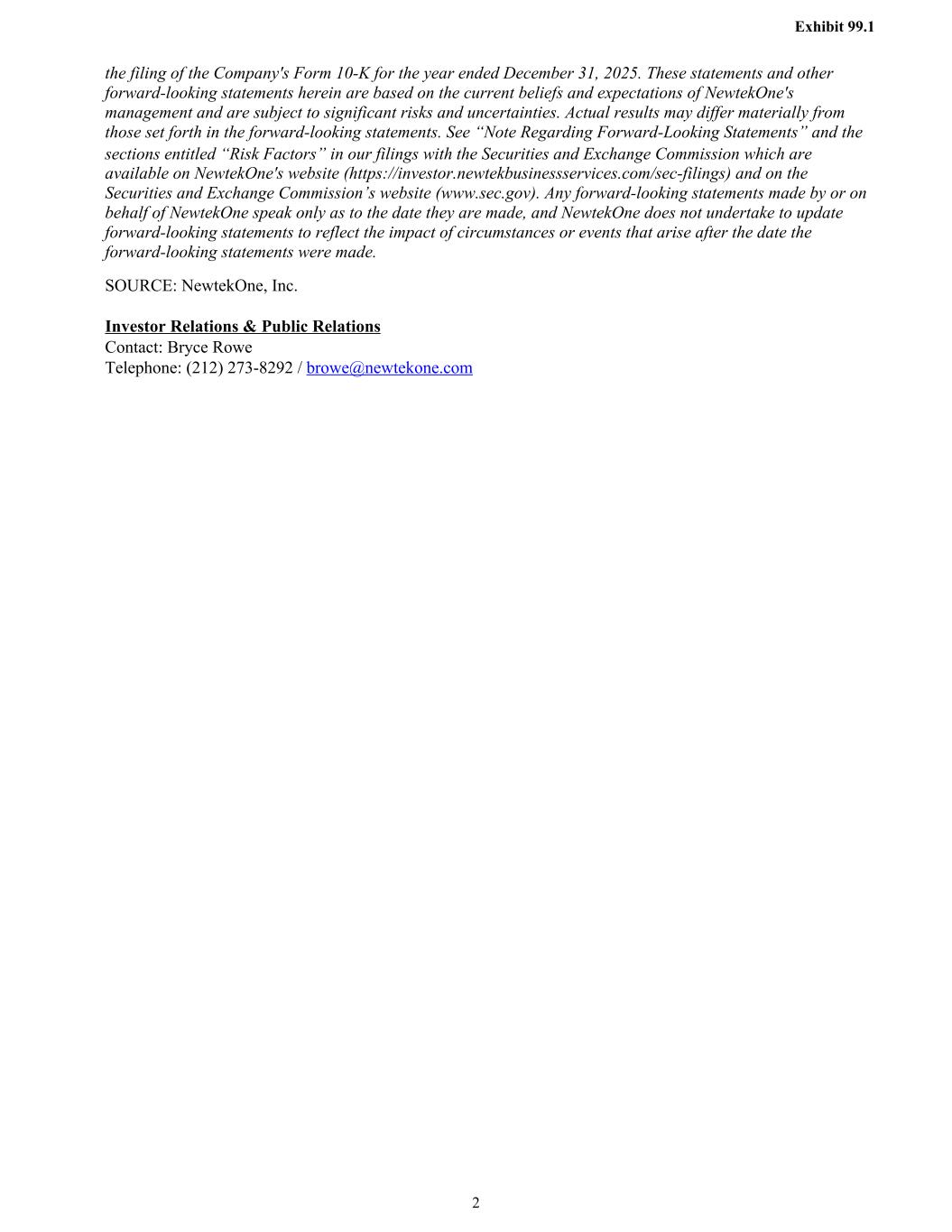 the filing of the Company's Form 10-K for the year ended December 31, 2025. These statements and other forward-looking statements herein are based on the current beliefs and expectations of NewtekOne's management and are subject to significant risks and uncertainties. Actual results may differ materially from those set forth in the forward-looking statements. See “Note Regarding Forward-Looking Statements” and the sections entitled “Risk Factors” in our filings with the Securities and Exchange Commission which are available on NewtekOne's website (https://investor.newtekbusinessservices.com/sec-filings) and on the Securities and Exchange Commission’s website (www.sec.gov). Any forward-looking statements made by or on behalf of NewtekOne speak only as to the date they are made, and NewtekOne does not undertake to update forward-looking statements to reflect the impact of circumstances or events that arise after the date the forward-looking statements were made. SOURCE: NewtekOne, Inc. Investor Relations & Public Relations Contact: Bryce Rowe Telephone: (212) 273-8292 / browe@newtekone.com Exhibit 99.1 2