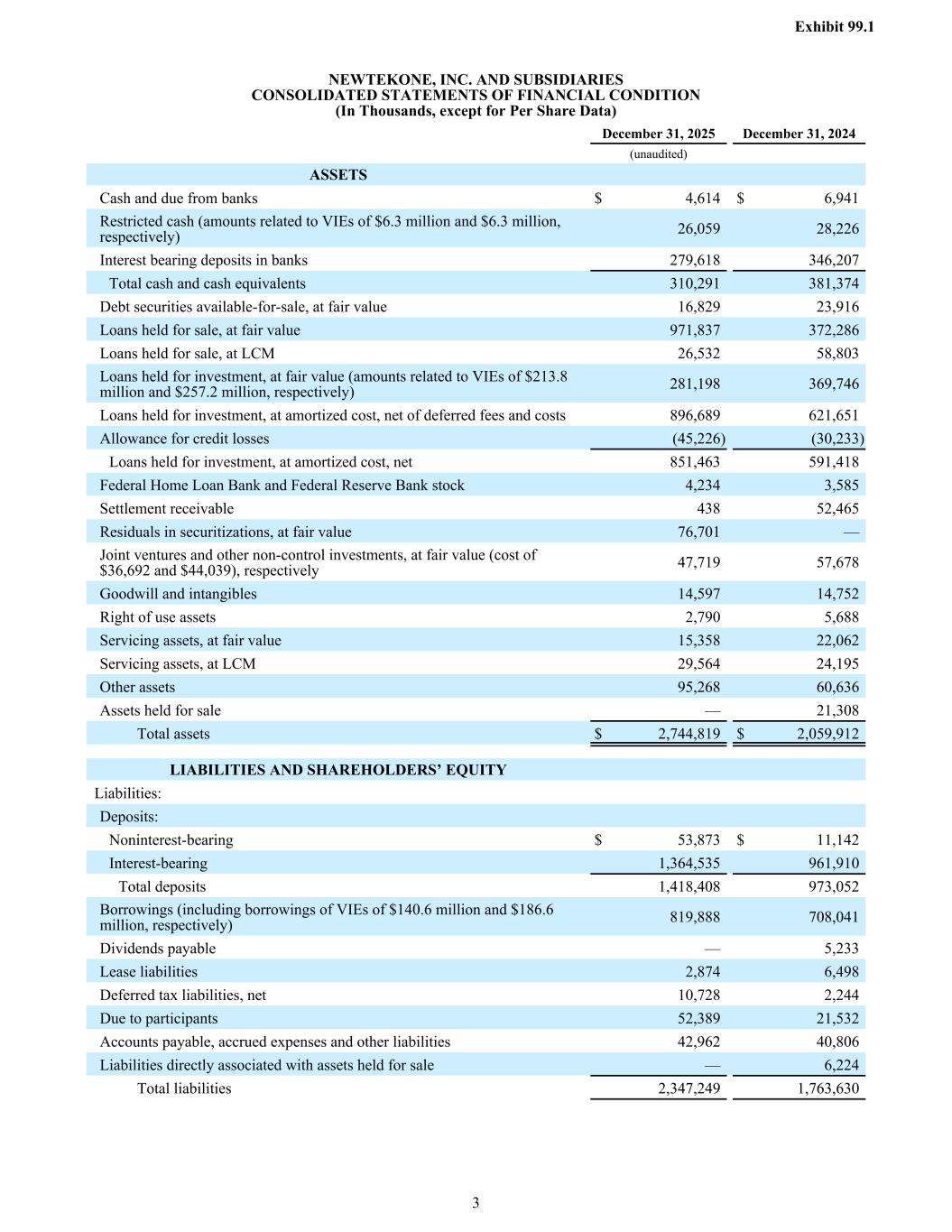 (unaudited) ASSETS Cash and due from banks $ 4,614 $ 6,941 Restricted cash (amounts related to VIEs of $6.3 million and $6.3 million, respectively) 26,059 28,226 Interest bearing deposits in banks 279,618 346,207 Total cash and cash equivalents 310,291 381,374 Debt securities available-for-sale, at fair value 16,829 23,916 Loans held for sale, at fair value 971,837 372,286 Loans held for sale, at LCM 26,532 58,803 Loans held for investment, at fair value (amounts related to VIEs of $213.8 million and $257.2 million, respectively) 281,198 369,746 Loans held for investment, at amortized cost, net of deferred fees and costs 896,689 621,651 Allowance for credit losses (45,226) (30,233) Loans held for investment, at amortized cost, net 851,463 591,418 Federal Home Loan Bank and Federal Reserve Bank stock 4,234 3,585 Settlement receivable 438 52,465 Residuals in securitizations, at fair value 76,701 — Joint ventures and other non-control investments, at fair value (cost of $36,692 and $44,039), respectively 47,719 57,678 Goodwill and intangibles 14,597 14,752 Right of use assets 2,790 5,688 Servicing assets, at fair value 15,358 22,062 Servicing assets, at LCM 29,564 24,195 Other assets 95,268 60,636 Assets held for sale — 21,308 Total assets $ 2,744,819 $ 2,059,912 LIABILITIES AND SHAREHOLDERS’ EQUITY Liabilities: Deposits: Noninterest-bearing $ 53,873 $ 11,142 Interest-bearing 1,364,535 961,910 Total deposits 1,418,408 973,052 Borrowings (including borrowings of VIEs of $140.6 million and $186.6 million, respectively) 819,888 708,041 Dividends payable — 5,233 Lease liabilities 2,874 6,498 Deferred tax liabilities, net 10,728 2,244 Due to participants 52,389 21,532 Accounts payable, accrued expenses and other liabilities 42,962 40,806 Liabilities directly associated with assets held for sale — 6,224 Total liabilities 2,347,249 1,763,630 NEWTEKONE, INC. AND SUBSIDIARIES CONSOLIDATED STATEMENTS OF FINANCIAL CONDITION (In Thousands, except for Per Share Data) December 31, 2025 December 31, 2024 Exhibit 99.1 3