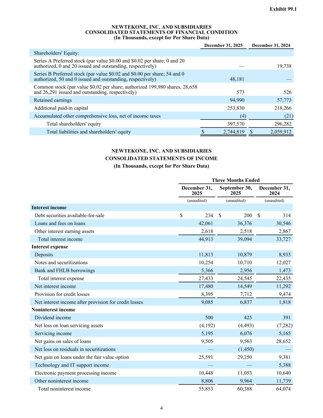 Shareholders' Equity: Series A Preferred stock (par value $0.00 and $0.02 per share; 0 and 20 authorized, 0 and 20 issued and outstanding, respectively) — 19,738 Series B Preferred stock (par value $0.02 and $0.00 per share; 54 and 0 authorized, 50 and 0 issued and outstanding, respectively) 48,181 — Common stock (par value $0.02 per share; authorized 199,980 shares, 28,658 and 26,291 issued and outstanding, respectively) 573 526 Retained earnings 94,990 57,773 Additional paid-in capital 253,830 218,266 Accumulated other comprehensive loss, net of income taxes (4) (21) Total shareholders' equity 397,570 296,282 Total liabilities and shareholders' equity $ 2,744,819 $ 2,059,912 NEWTEKONE, INC. AND SUBSIDIARIES CONSOLIDATED STATEMENTS OF FINANCIAL CONDITION (In Thousands, except for Per Share Data) December 31, 2025 December 31, 2024 Interest income Debt securities available-for-sale $ 234 $ 200 $ 314 Loans and fees on loans 42,061 36,376 30,546 Other interest earning assets 2,618 2,518 2,867 Total interest income 44,913 39,094 33,727 Interest expense Deposits 11,813 10,879 8,935 Notes and securitizations 10,254 10,710 12,027 Bank and FHLB borrowings 5,366 2,956 1,473 Total interest expense 27,433 24,545 22,435 Net interest income 17,480 14,549 11,292 Provision for credit losses 8,395 7,712 9,474 Net interest income after provision for credit losses 9,085 6,837 1,818 Noninterest income Dividend income 500 425 391 Net loss on loan servicing assets (4,192) (4,493) (7,282) Servicing income 5,195 6,076 5,165 Net gains on sales of loans 9,505 9,563 28,652 Net loss on residuals in securitizations — (1,450) — Net gain on loans under the fair value option 25,591 29,250 9,381 Technology and IT support income — — 5,388 Electronic payment processing income 10,448 11,053 10,640 Other noninterest income 8,806 9,964 11,739 Total noninterest income 55,853 60,388 64,074 NEWTEKONE, INC. AND SUBSIDIARIES CONSOLIDATED STATEMENTS OF INCOME (In Thousands, except for Per Share Data) Three Months Ended December 31, 2025 September 30, 2025 December 31, 2024 (unaudited) (unaudited) (unaudited) Exhibit 99.1 4