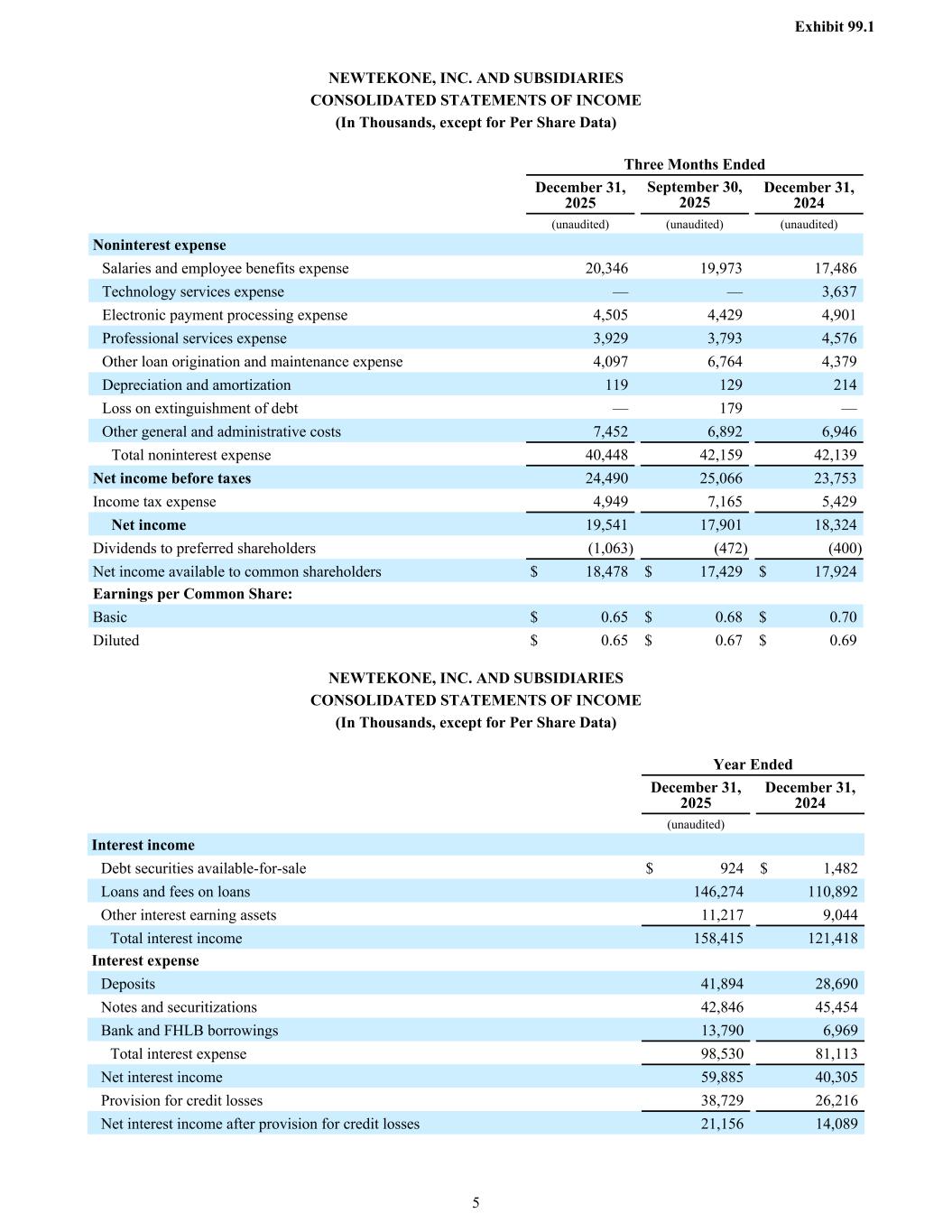 Noninterest expense Salaries and employee benefits expense 20,346 19,973 17,486 Technology services expense — — 3,637 Electronic payment processing expense 4,505 4,429 4,901 Professional services expense 3,929 3,793 4,576 Other loan origination and maintenance expense 4,097 6,764 4,379 Depreciation and amortization 119 129 214 Loss on extinguishment of debt — 179 — Other general and administrative costs 7,452 6,892 6,946 Total noninterest expense 40,448 42,159 42,139 Net income before taxes 24,490 25,066 23,753 Income tax expense 4,949 7,165 5,429 Net income 19,541 17,901 18,324 Dividends to preferred shareholders (1,063) (472) (400) Net income available to common shareholders $ 18,478 $ 17,429 $ 17,924 Earnings per Common Share: Basic $ 0.65 $ 0.68 $ 0.70 Diluted $ 0.65 $ 0.67 $ 0.69 NEWTEKONE, INC. AND SUBSIDIARIES CONSOLIDATED STATEMENTS OF INCOME (In Thousands, except for Per Share Data) Three Months Ended December 31, 2025 September 30, 2025 December 31, 2024 (unaudited) (unaudited) (unaudited) Interest income Debt securities available-for-sale $ 924 $ 1,482 Loans and fees on loans 146,274 110,892 Other interest earning assets 11,217 9,044 Total interest income 158,415 121,418 Interest expense Deposits 41,894 28,690 Notes and securitizations 42,846 45,454 Bank and FHLB borrowings 13,790 6,969 Total interest expense 98,530 81,113 Net interest income 59,885 40,305 Provision for credit losses 38,729 26,216 Net interest income after provision for credit losses 21,156 14,089 NEWTEKONE, INC. AND SUBSIDIARIES CONSOLIDATED STATEMENTS OF INCOME (In Thousands, except for Per Share Data) Year Ended December 31, 2025 December 31, 2024 (unaudited) Exhibit 99.1 5