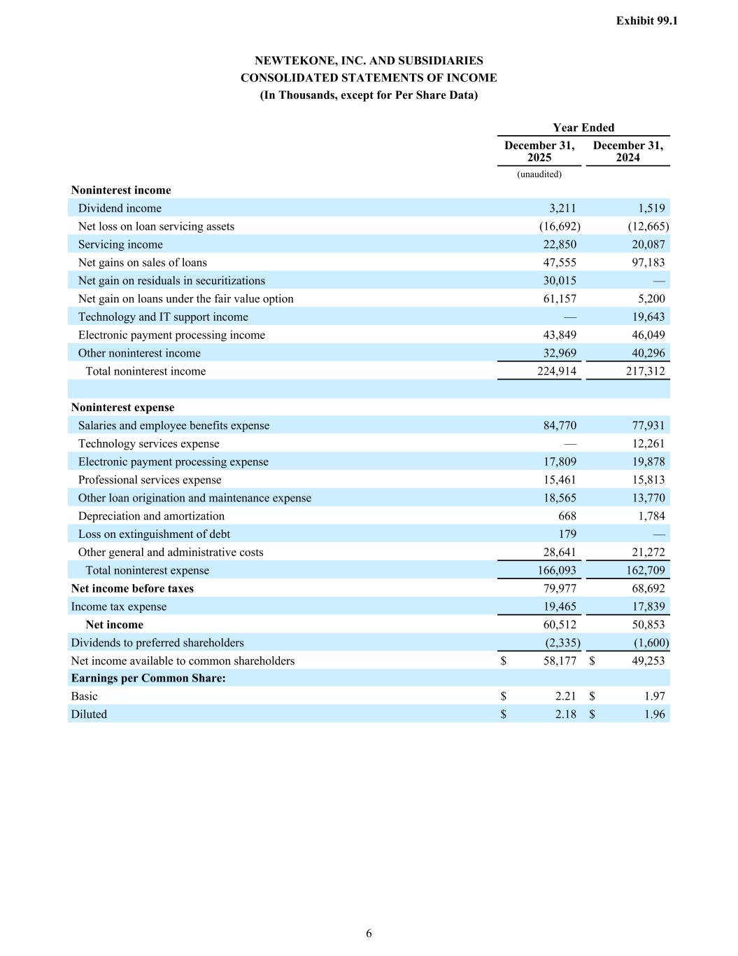 Noninterest income Dividend income 3,211 1,519 Net loss on loan servicing assets (16,692) (12,665) Servicing income 22,850 20,087 Net gains on sales of loans 47,555 97,183 Net gain on residuals in securitizations 30,015 — Net gain on loans under the fair value option 61,157 5,200 Technology and IT support income — 19,643 Electronic payment processing income 43,849 46,049 Other noninterest income 32,969 40,296 Total noninterest income 224,914 217,312 Noninterest expense Salaries and employee benefits expense 84,770 77,931 Technology services expense — 12,261 Electronic payment processing expense 17,809 19,878 Professional services expense 15,461 15,813 Other loan origination and maintenance expense 18,565 13,770 Depreciation and amortization 668 1,784 Loss on extinguishment of debt 179 — Other general and administrative costs 28,641 21,272 Total noninterest expense 166,093 162,709 Net income before taxes 79,977 68,692 Income tax expense 19,465 17,839 Net income 60,512 50,853 Dividends to preferred shareholders (2,335) (1,600) Net income available to common shareholders $ 58,177 $ 49,253 Earnings per Common Share: Basic $ 2.21 $ 1.97 Diluted $ 2.18 $ 1.96 NEWTEKONE, INC. AND SUBSIDIARIES CONSOLIDATED STATEMENTS OF INCOME (In Thousands, except for Per Share Data) Year Ended December 31, 2025 December 31, 2024 (unaudited) Exhibit 99.1 6
