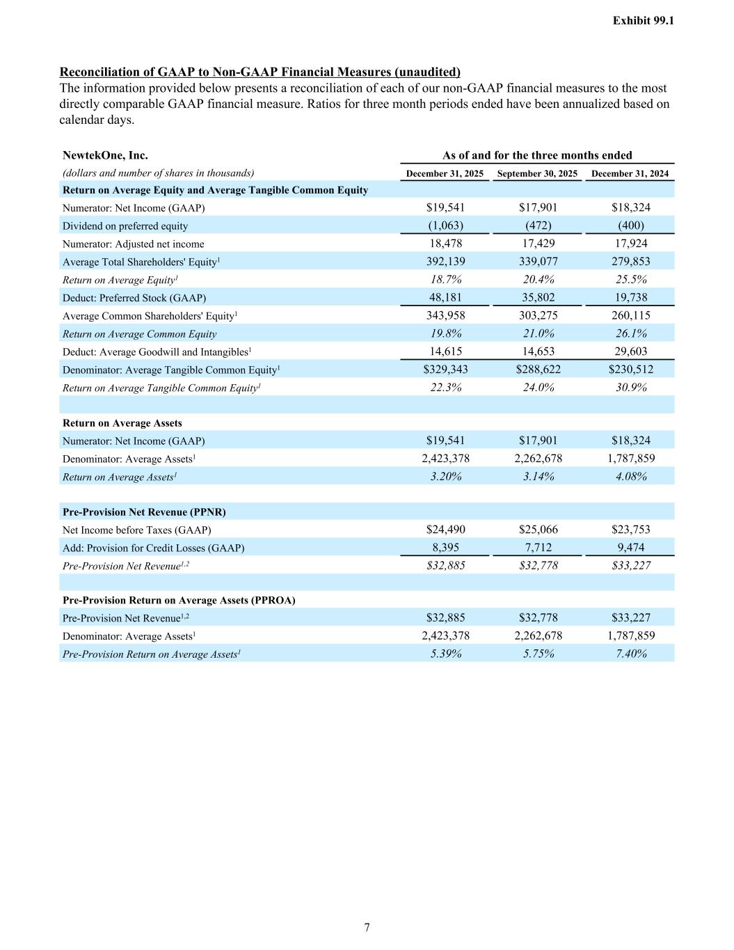Reconciliation of GAAP to Non-GAAP Financial Measures (unaudited) The information provided below presents a reconciliation of each of our non-GAAP financial measures to the most directly comparable GAAP financial measure. Ratios for three month periods ended have been annualized based on calendar days. NewtekOne, Inc. As of and for the three months ended (dollars and number of shares in thousands) December 31, 2025 September 30, 2025 December 31, 2024 Return on Average Equity and Average Tangible Common Equity Numerator: Net Income (GAAP) $19,541 $17,901 $18,324 Dividend on preferred equity (1,063) (472) (400) Numerator: Adjusted net income 18,478 17,429 17,924 Average Total Shareholders' Equity1 392,139 339,077 279,853 Return on Average Equity1 18.7% 20.4% 25.5% Deduct: Preferred Stock (GAAP) 48,181 35,802 19,738 Average Common Shareholders' Equity1 343,958 303,275 260,115 Return on Average Common Equity 19.8% 21.0% 26.1% Deduct: Average Goodwill and Intangibles1 14,615 14,653 29,603 Denominator: Average Tangible Common Equity1 $329,343 $288,622 $230,512 Return on Average Tangible Common Equity1 22.3% 24.0% 30.9% Return on Average Assets Numerator: Net Income (GAAP) $19,541 $17,901 $18,324 Denominator: Average Assets1 2,423,378 2,262,678 1,787,859 Return on Average Assets1 3.20% 3.14% 4.08% Pre-Provision Net Revenue (PPNR) Net Income before Taxes (GAAP) $24,490 $25,066 $23,753 Add: Provision for Credit Losses (GAAP) 8,395 7,712 9,474 Pre-Provision Net Revenue1,2 $32,885 $32,778 $33,227 Pre-Provision Return on Average Assets (PPROA) Pre-Provision Net Revenue1,2 $32,885 $32,778 $33,227 Denominator: Average Assets1 2,423,378 2,262,678 1,787,859 Pre-Provision Return on Average Assets1 5.39% 5.75% 7.40% Exhibit 99.1 7
