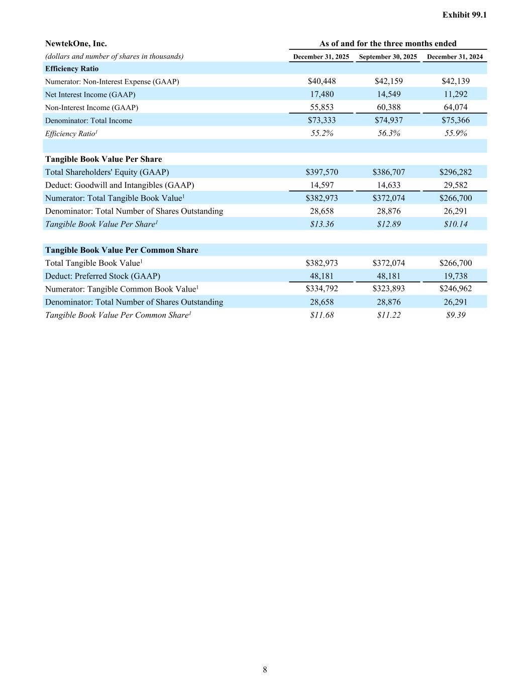 NewtekOne, Inc. As of and for the three months ended (dollars and number of shares in thousands) December 31, 2025 September 30, 2025 December 31, 2024 Efficiency Ratio Numerator: Non-Interest Expense (GAAP) $40,448 $42,159 $42,139 Net Interest Income (GAAP) 17,480 14,549 11,292 Non-Interest Income (GAAP) 55,853 60,388 64,074 Denominator: Total Income $73,333 $74,937 $75,366 Efficiency Ratio1 55.2% 56.3% 55.9% Tangible Book Value Per Share Total Shareholders' Equity (GAAP) $397,570 $386,707 $296,282 Deduct: Goodwill and Intangibles (GAAP) 14,597 14,633 29,582 Numerator: Total Tangible Book Value1 $382,973 $372,074 $266,700 Denominator: Total Number of Shares Outstanding 28,658 28,876 26,291 Tangible Book Value Per Share1 $13.36 $12.89 $10.14 Tangible Book Value Per Common Share Total Tangible Book Value1 $382,973 $372,074 $266,700 Deduct: Preferred Stock (GAAP) 48,181 48,181 19,738 Numerator: Tangible Common Book Value1 $334,792 $323,893 $246,962 Denominator: Total Number of Shares Outstanding 28,658 28,876 26,291 Tangible Book Value Per Common Share1 $11.68 $11.22 $9.39 Exhibit 99.1 8