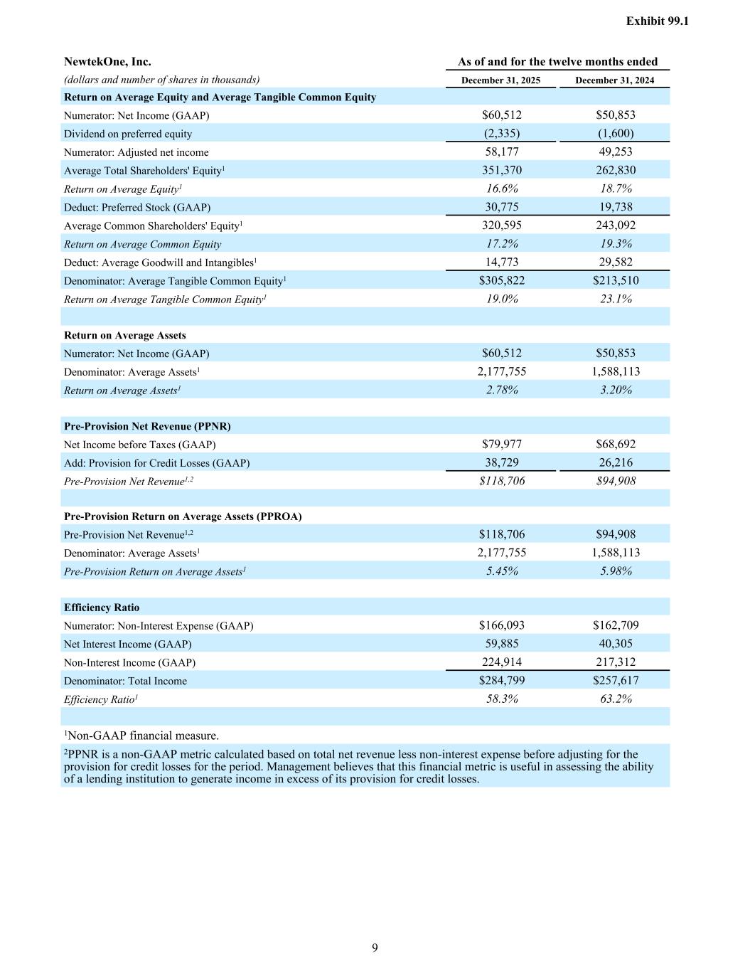 NewtekOne, Inc. As of and for the twelve months ended (dollars and number of shares in thousands) December 31, 2025 December 31, 2024 Return on Average Equity and Average Tangible Common Equity Numerator: Net Income (GAAP) $60,512 $50,853 Dividend on preferred equity (2,335) (1,600) Numerator: Adjusted net income 58,177 49,253 Average Total Shareholders' Equity1 351,370 262,830 Return on Average Equity1 16.6% 18.7% Deduct: Preferred Stock (GAAP) 30,775 19,738 Average Common Shareholders' Equity1 320,595 243,092 Return on Average Common Equity 17.2% 19.3% Deduct: Average Goodwill and Intangibles1 14,773 29,582 Denominator: Average Tangible Common Equity1 $305,822 $213,510 Return on Average Tangible Common Equity1 19.0% 23.1% Return on Average Assets Numerator: Net Income (GAAP) $60,512 $50,853 Denominator: Average Assets1 2,177,755 1,588,113 Return on Average Assets1 2.78% 3.20% Pre-Provision Net Revenue (PPNR) Net Income before Taxes (GAAP) $79,977 $68,692 Add: Provision for Credit Losses (GAAP) 38,729 26,216 Pre-Provision Net Revenue1,2 $118,706 $94,908 Pre-Provision Return on Average Assets (PPROA) Pre-Provision Net Revenue1,2 $118,706 $94,908 Denominator: Average Assets1 2,177,755 1,588,113 Pre-Provision Return on Average Assets1 5.45% 5.98% Efficiency Ratio Numerator: Non-Interest Expense (GAAP) $166,093 $162,709 Net Interest Income (GAAP) 59,885 40,305 Non-Interest Income (GAAP) 224,914 217,312 Denominator: Total Income $284,799 $257,617 Efficiency Ratio1 58.3% 63.2% 1Non-GAAP financial measure. 2PPNR is a non-GAAP metric calculated based on total net revenue less non-interest expense before adjusting for the provision for credit losses for the period. Management believes that this financial metric is useful in assessing the ability of a lending institution to generate income in excess of its provision for credit losses. Exhibit 99.1 9