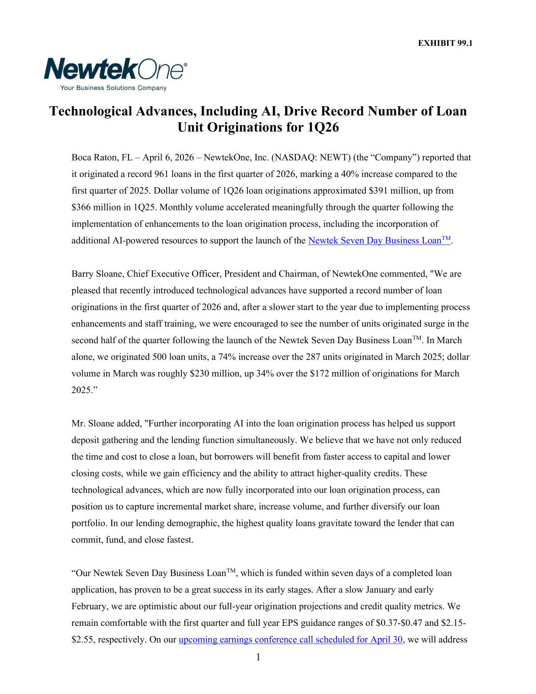 1 EXHIBIT 99.1 Technological Advances, Including AI, Drive Record Number of Loan Unit Originations for 1Q26 Boca Raton, FL – April 6, 2026 – NewtekOne, Inc. (NASDAQ: NEWT) (the “Company”) reported that it originated a record 961 loans in the first quarter of 2026, marking a 40% increase compared to the first quarter of 2025. Dollar volume of 1Q26 loan originations approximated $391 million, up from $366 million in 1Q25. Monthly volume accelerated meaningfully through the quarter following the implementation of enhancements to the loan origination process, including the incorporation of additional AI-powered resources to support the launch of the Newtek Seven Day Business LoanTM. Barry Sloane, Chief Executive Officer, President and Chairman, of NewtekOne commented, "We are pleased that recently introduced technological advances have supported a record number of loan originations in the first quarter of 2026 and, after a slower start to the year due to implementing process enhancements and staff training, we were encouraged to see the number of units originated surge in the second half of the quarter following the launch of the Newtek Seven Day Business LoanTM. In March alone, we originated 500 loan units, a 74% increase over the 287 units originated in March 2025; dollar volume in March was roughly $230 million, up 34% over the $172 million of originations for March 2025.” Mr. Sloane added, "Further incorporating AI into the loan origination process has helped us support deposit gathering and the lending function simultaneously. We believe that we have not only reduced the time and cost to close a loan, but borrowers will benefit from faster access to capital and lower closing costs, while we gain efficiency and the ability to attract higher-quality credits. These technological advances, which are now fully incorporated into our loan origination process, can position us to capture incremental market share, increase volume, and further diversify our loan portfolio. In our lending demographic, the highest quality loans gravitate toward the lender that can commit, fund, and close fastest. “Our Newtek Seven Day Business LoanTM, which is funded within seven days of a completed loan application, has proven to be a great success in its early stages. After a slow January and early February, we are optimistic about our full-year origination projections and credit quality metrics. We remain comfortable with the first quarter and full year EPS guidance ranges of $0.37-$0.47 and $2.15- $2.55, respectively. On our upcoming earnings conference call scheduled for April 30, we will address