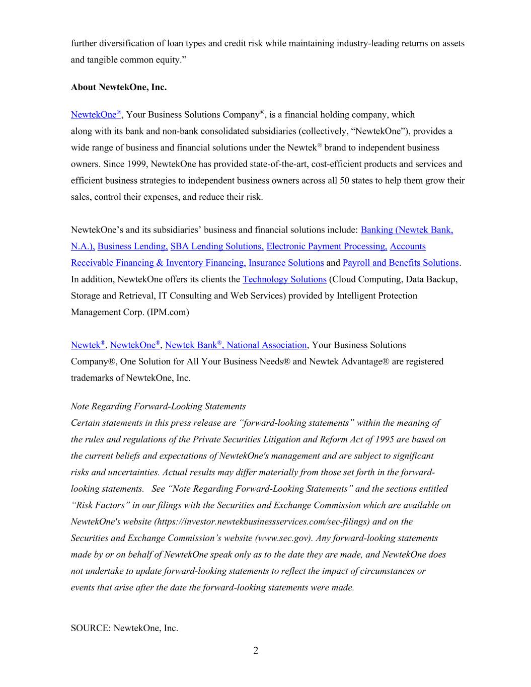2 further diversification of loan types and credit risk while maintaining industry-leading returns on assets and tangible common equity.” About NewtekOne, Inc. NewtekOne®, Your Business Solutions Company®, is a financial holding company, which along with its bank and non-bank consolidated subsidiaries (collectively, “NewtekOne”), provides a wide range of business and financial solutions under the Newtek® brand to independent business owners. Since 1999, NewtekOne has provided state-of-the-art, cost-efficient products and services and efficient business strategies to independent business owners across all 50 states to help them grow their sales, control their expenses, and reduce their risk. NewtekOne’s and its subsidiaries’ business and financial solutions include: Banking (Newtek Bank, N.A.), Business Lending, SBA Lending Solutions, Electronic Payment Processing, Accounts Receivable Financing & Inventory Financing, Insurance Solutions and Payroll and Benefits Solutions. In addition, NewtekOne offers its clients the Technology Solutions (Cloud Computing, Data Backup, Storage and Retrieval, IT Consulting and Web Services) provided by Intelligent Protection Management Corp. (IPM.com) Newtek®, NewtekOne®, Newtek Bank®, National Association, Your Business Solutions Company®, One Solution for All Your Business Needs® and Newtek Advantage® are registered trademarks of NewtekOne, Inc. Note Regarding Forward-Looking Statements Certain statements in this press release are “forward-looking statements” within the meaning of the rules and regulations of the Private Securities Litigation and Reform Act of 1995 are based on the current beliefs and expectations of NewtekOne's management and are subject to significant risks and uncertainties. Actual results may differ materially from those set forth in the forward- looking statements. See “Note Regarding Forward-Looking Statements” and the sections entitled “Risk Factors” in our filings with the Securities and Exchange Commission which are available on NewtekOne's website (https://investor.newtekbusinessservices.com/sec-filings) and on the Securities and Exchange Commission’s website (www.sec.gov). Any forward-looking statements made by or on behalf of NewtekOne speak only as to the date they are made, and NewtekOne does not undertake to update forward-looking statements to reflect the impact of circumstances or events that arise after the date the forward-looking statements were made. SOURCE: NewtekOne, Inc.