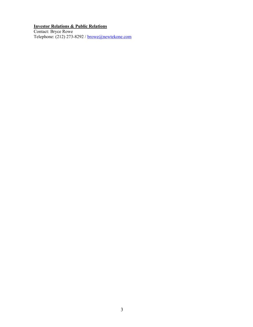 3 Investor Relations & Public Relations Contact: Bryce Rowe Telephone: (212) 273-8292 / browe@newtekone.com