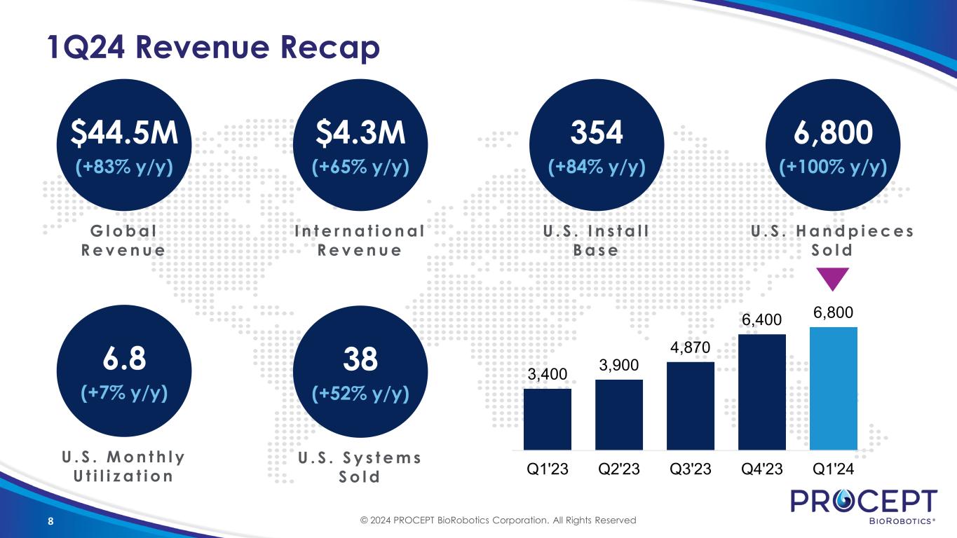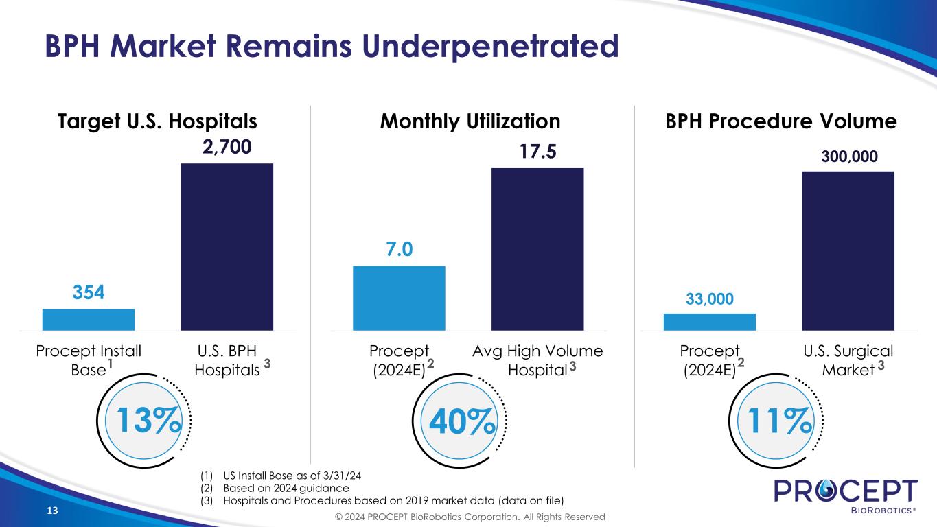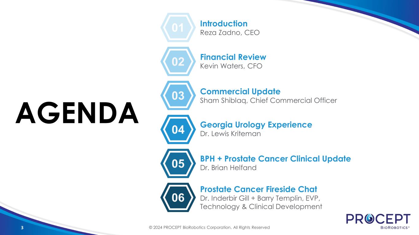 2 Safe Harbor Statement This presentation and accompanying oral presentation contain “forward-looking statements” within the meaning of the Private Securities Litigation Reform Act of 1995, including the expected financial results of PROCEPT BioRobotics Corporation (the “Company”). Words such as “anticipates,” “believes,” “expects,” “intends,” “projects,” “anticipates,” and “future” or similar expressions are intended to identify forward-looking statements. Any forward-looking statements made by us in this presentation speaks only as of the date on which it was made and are based on management’s current expectations of future events, assumptions, estimates, and beliefs, and are subject to a number of risks and uncertainties that could cause actual results to differ materially and adversely from those set forth in or implied by such forward-looking statements. Factors that could cause actual results to differ materially from those described in the forward-looking statements include, among others: (i) the rate and degree of market acceptance of the AQUABEAM Robotic System and Aquablation therapy and descriptions of the Company’s revenues, gross margin, profitability, operating expenses, or installed base growth, (ii) the establishment and maintenance of consistent and favorable payment policies for Aquablation therapy, (iii) the rate of growth of the commercial sales and marketing organization and the ability to manage this anticipated growth, (iv) the impact on volumes of elective procedures performed by health care providers and hospital medical device budgets, (v) the effects of increased competition as well as innovations by new and existing competitors in the market for treatments for benign prostatic hyperplasia, (vi) the ability to obtain the required regulatory approvals and clearances to market and sell the AQUABEAM Robotic System in certain other countries, (vii) the development and protection of future innovation, (viii) dependence on a limited number of third-party suppliers for components of the AQUABEAM Robotic System, (ix) the maintenance of intellectual property rights and the ability to operate the business without infringing the intellectual property rights and proprietary technology of third parties, (x) the successful completion of clinical trials and (xi) the adoption of our technology for additional indications. This presentation and the accompanying oral presentation also contain estimates and other statistical data made by independent parties and by us relating to market size and growth and other data about our industry. This data involves a number of assumptions and limitations, and you are cautioned not to give undue weight to such estimates. In addition, projections, assumptions, and estimates of our future performance and the future performance of the markets in which we compete are necessarily subject to a high degree of uncertainty and risk. Factors that could cause actual results to differ materially from those contemplated in this presentation can be found in the Risk Factors section of the Company’s public filings with the Securities and Exchange Commission (“SEC”), including the Annual Report on Form 10-K filed with the SEC on February 28, 2024 and any current and periodic reports filed thereafter, available at www.sec.gov. Because forward-looking statements are inherently subject to risks and uncertainties, you should not rely on these forward-looking statements as predictions of future events. All statements other than statements of historical fact are forward-looking statements. Except to the extent required by law, the Company undertakes no obligation to update or review any estimate, projection, or forward-looking statement. Actual results may differ from those set forth in this presentation due to the risks and uncertainties inherent in the Company’s business. In light of the foregoing, investors are urged not to rely on any forward-looking statement or third-party data in reaching any conclusion or making any investment decision about any securities of the Company. This presentation regarding the Company shall not constitute an offer to sell or the solicitation of an offer to buy any securities, nor shall there be any sale of these securities in any state or jurisdiction in which such offer, solicitation or sale would be unlawful prior to registration or qualification under the securities laws of any such state or jurisdiction. Sales and offers to sell PROCEPT BioRobotics securities will only be made in accordance with the Securities Act of 1933, as amended, and applicable SEC regulations, including prospectus requirements. © 2024 PROCEPT BioRobotics Corporation. All Rights Reserved