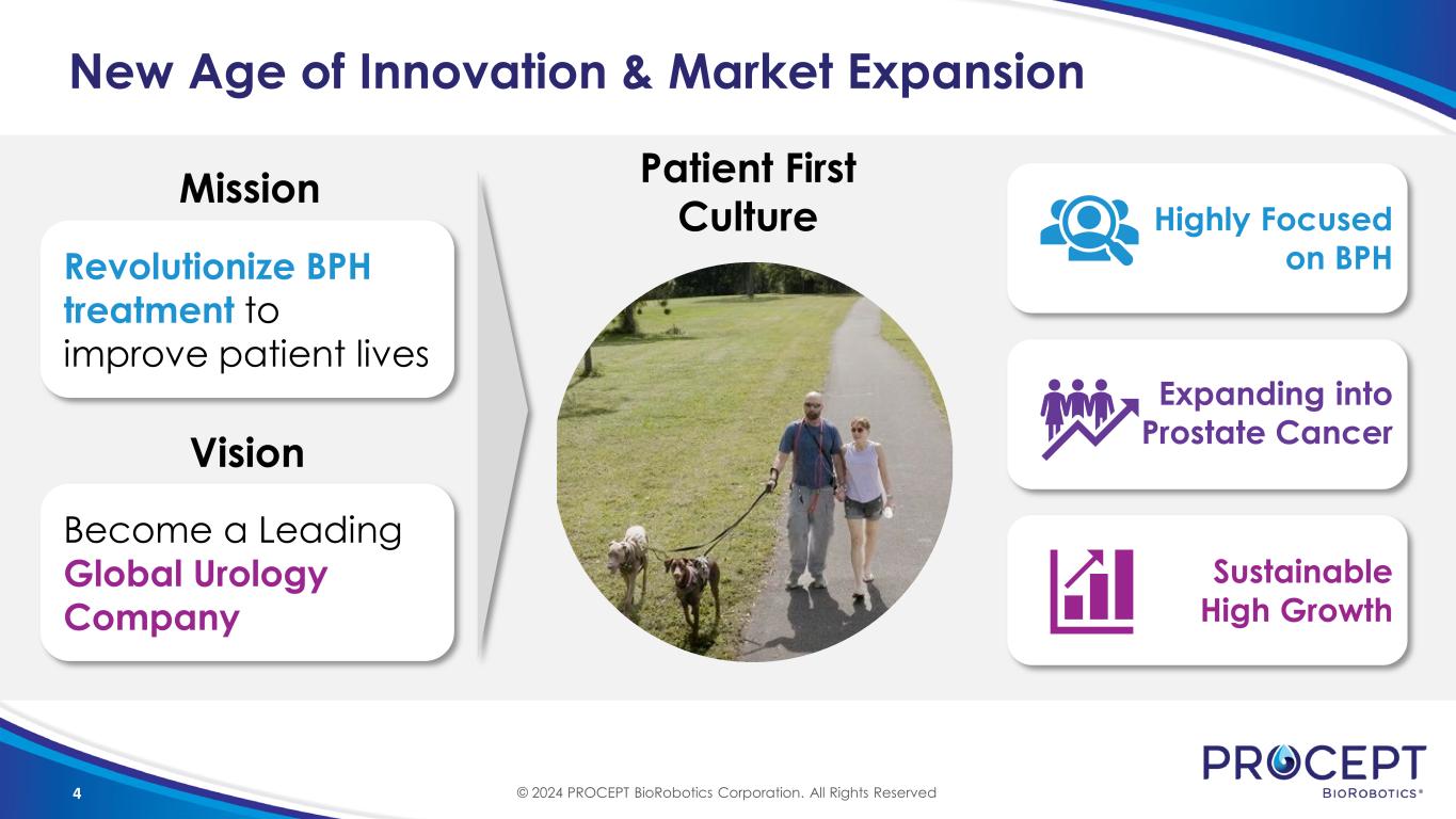 3 AGENDA 01 02 03 04 05 06 Introduction Reza Zadno, CEO Financial Review Kevin Waters, CFO Commercial Update Sham Shiblaq, Chief Commercial Officer Georgia Urology Experience Dr. Lewis Kriteman BPH + Prostate Cancer Clinical Update Dr. Brian Helfand Prostate Cancer Fireside Chat Dr. Inderbir Gill + Barry Templin, EVP, Technology & Clinical Development © 2024 PROCEPT BioRobotics Corporation. All Rights Reserved