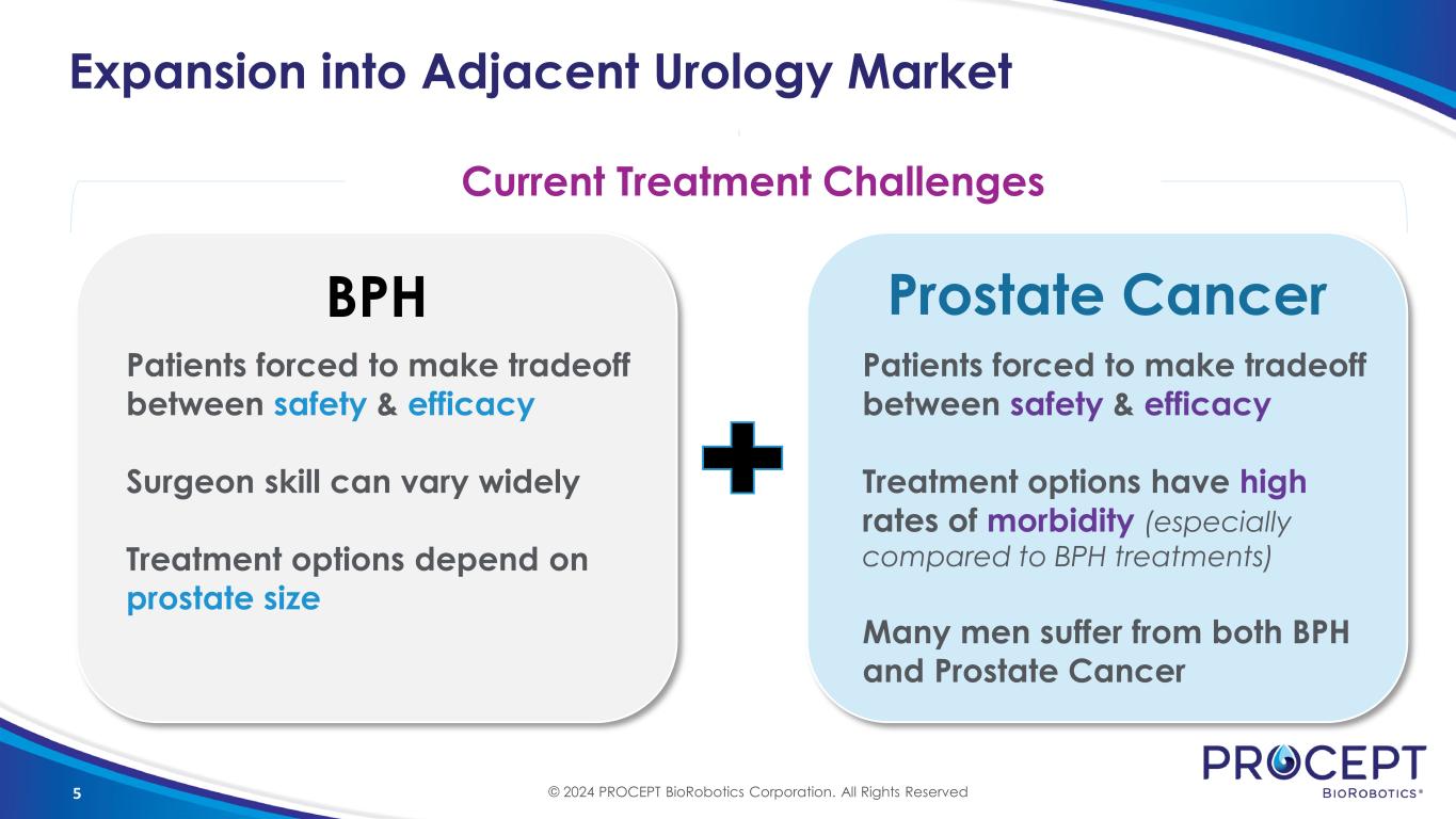 4 New Age of Innovation & Market Expansion Sustainable High Growth Highly Focused on BPH Expanding into Prostate Cancer Patient First Culture Revolutionize BPH treatment to improve patient lives Become a Leading Global Urology Company Mission Vision © 2024 PROCEPT BioRobotics Corporation. All Rights Reserved