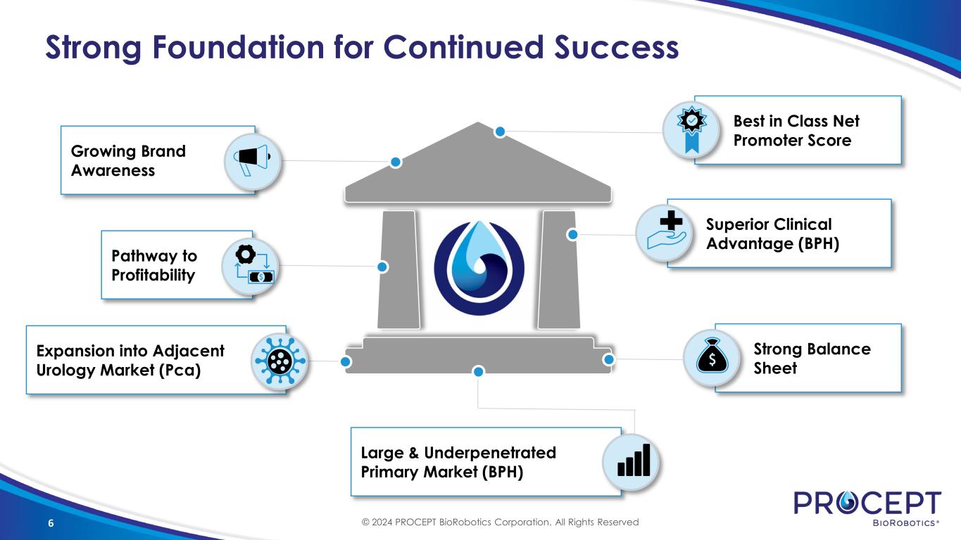5 Expansion into Adjacent Urology Market Current Treatment Challenges BPH Prostate Cancer Patients forced to make tradeoff between safety & efficacy Surgeon skill can vary widely Treatment options depend on prostate size Patients forced to make tradeoff between safety & efficacy Treatment options have high rates of morbidity (especially compared to BPH treatments) Many men suffer from both BPH and Prostate Cancer © 2024 PROCEPT BioRobotics Corporation. All Rights Reserved