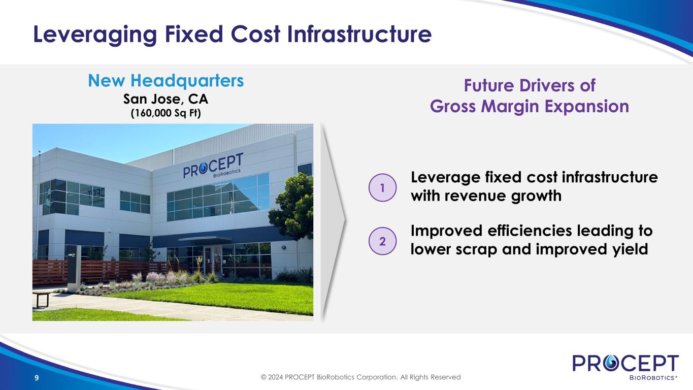 8 1Q24 Revenue Recap 3,400 3,900 4,870 6,400 6,800 Q1'23 Q2'23 Q3'23 Q4'23 Q1'24 $44.5M (+83% y/y) G l o b a l R e v e n u e $4.3M (+65% y/y) I n t e r n a t i o n a l R e v e n u e 354 (+84% y/y) U . S . I n s t a l l B a s e 6,800 (+100% y/y) U . S . H a n d p i e c e s S o l d 6.8 (+7% y/y) U . S . M o n t h l y U t i l i z a t i o n 38 (+52% y/y) U . S . S y s t e m s S o l d © 2024 PROCEPT BioRobotics Corporation. All Rights Reserved