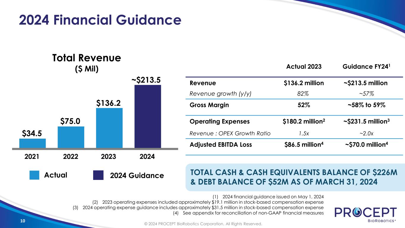 9 Leveraging Fixed Cost Infrastructure New Headquarters San Jose, CA (160,000 Sq Ft) Future Drivers of Gross Margin Expansion 1 Leverage fixed cost infrastructure with revenue growth 2 Improved efficiencies leading to lower scrap and improved yield © 2024 PROCEPT BioRobotics Corporation. All Rights Reserved
