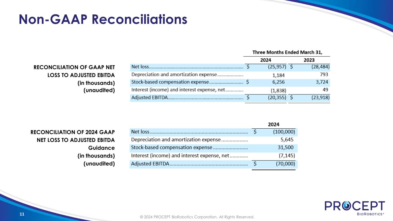 10 2024 Financial Guidance Total Revenue ($ Mil) $34.5 Actual 2024 Guidance $75.0 $136.2 ~$213.5 (1) 2024 financial guidance issued on May 1, 2024 (2) 2023 operating expenses included approximately $19.1 million in stock-based compensation expense (3) 2024 operating expense guidance includes approximately $31.5 million in stock-based compensation expense (4) See appendix for reconciliation of non-GAAP financial measures Actual 2023 Guidance FY241 Revenue Revenue growth (y/y) $136.2 million 82% ~$213.5 million ~57% Gross Margin 52% ~58% to 59% Operating Expenses Revenue : OPEX Growth Ratio $180.2 million2 1.5x ~$231.5 million3 ~2.0x Adjusted EBITDA Loss $86.5 million4 ~$70.0 million4 TOTAL CASH & CASH EQUIVALENTS BALANCE OF $226M & DEBT BALANCE OF $52M AS OF MARCH 31, 2024 © 2024 PROCEPT BioRobotics Corporation. All Rights Reserved. 2024202320222021