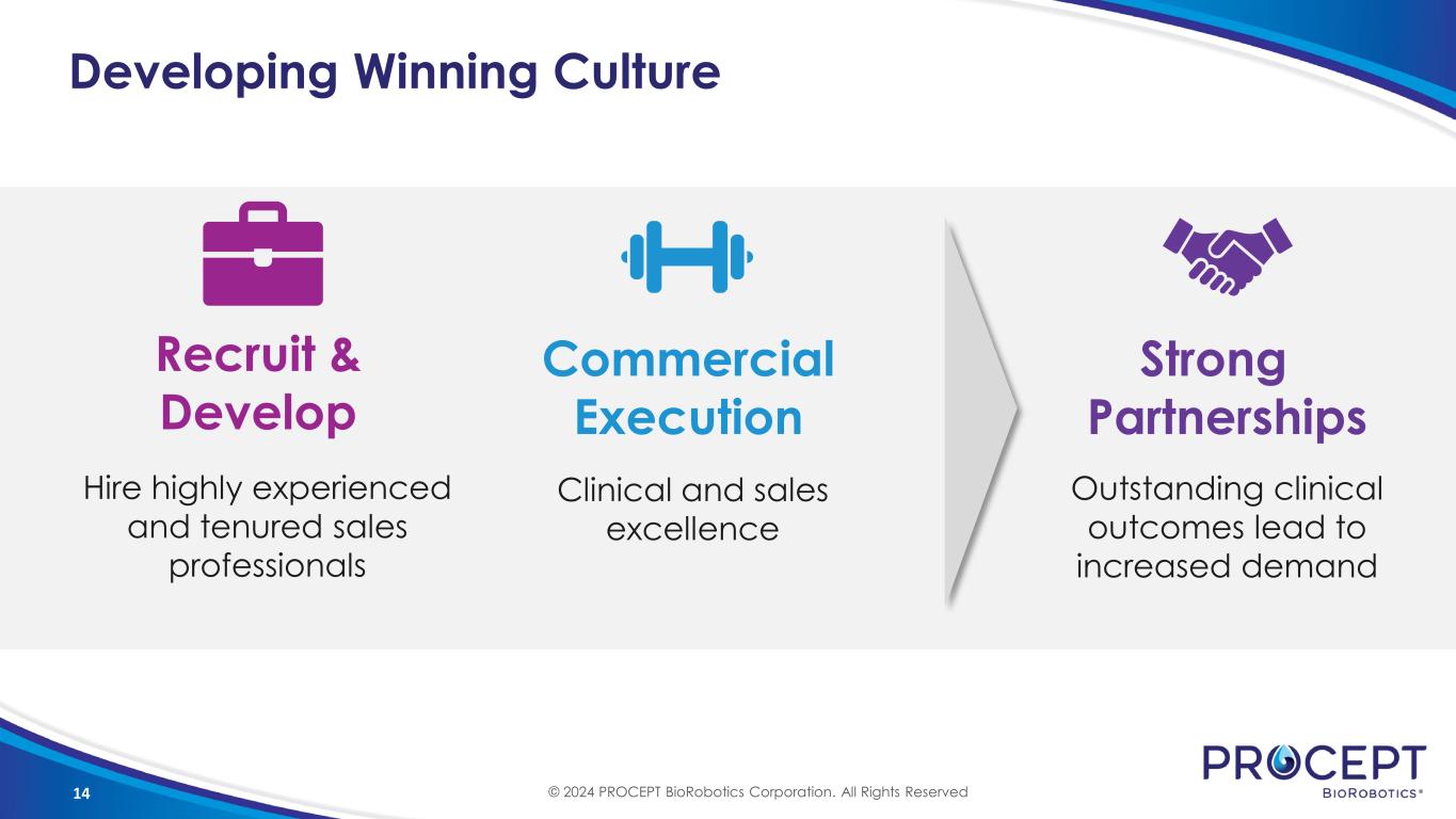 13 BPH Market Remains Underpenetrated 354 2,700 Procept Install Base U.S. BPH Hospitals 7.0 17.5 Procept (2024E) Avg High Volume Hospital 33,000 300,000 Procept (2024E) U.S. Surgical Market Target U.S. Hospitals Monthly Utilization BPH Procedure Volume 13% 40% 11% 1 2 2 (1) US Install Base as of 3/31/24 (2) Based on 2024 guidance (3) Hospitals and Procedures based on 2019 market data (data on file) © 2024 PROCEPT BioRobotics Corporation. All Rights Reserved 3 3 3