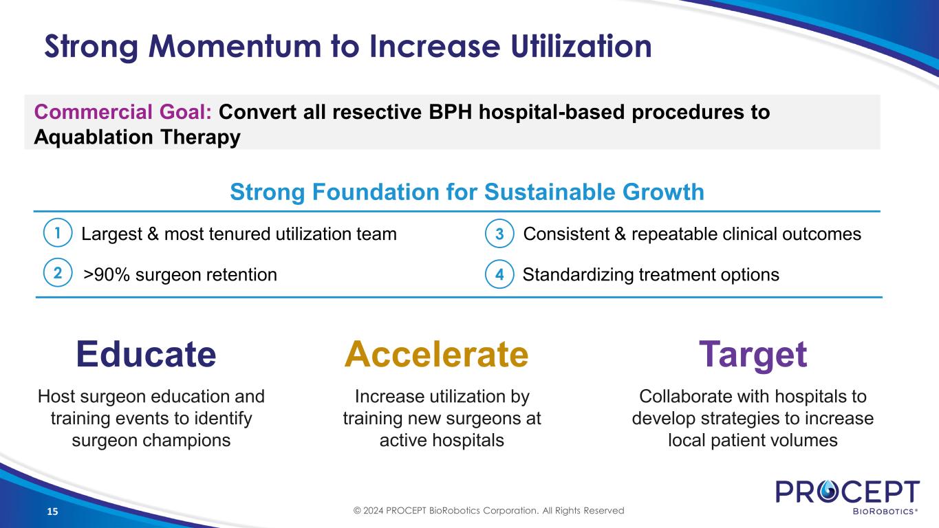 14 Developing Winning Culture Hire highly experienced and tenured sales professionals Recruit & Develop Clinical and sales excellence Commercial Execution Outstanding clinical outcomes lead to increased demand Strong Partnerships © 2024 PROCEPT BioRobotics Corporation. All Rights Reserved