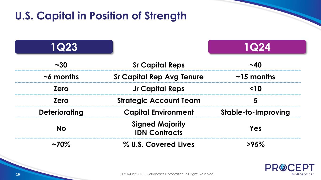 15 Strong Momentum to Increase Utilization Commercial Goal: Convert all resective BPH hospital-based procedures to Aquablation Therapy Strong Foundation for Sustainable Growth 1 Largest & most tenured utilization team 2 >90% surgeon retention 3 Consistent & repeatable clinical outcomes 4 Standardizing treatment options Host surgeon education and training events to identify surgeon champions Educate Collaborate with hospitals to develop strategies to increase local patient volumes Target Increase utilization by training new surgeons at active hospitals Accelerate © 2024 PROCEPT BioRobotics Corporation. All Rights Reserved
