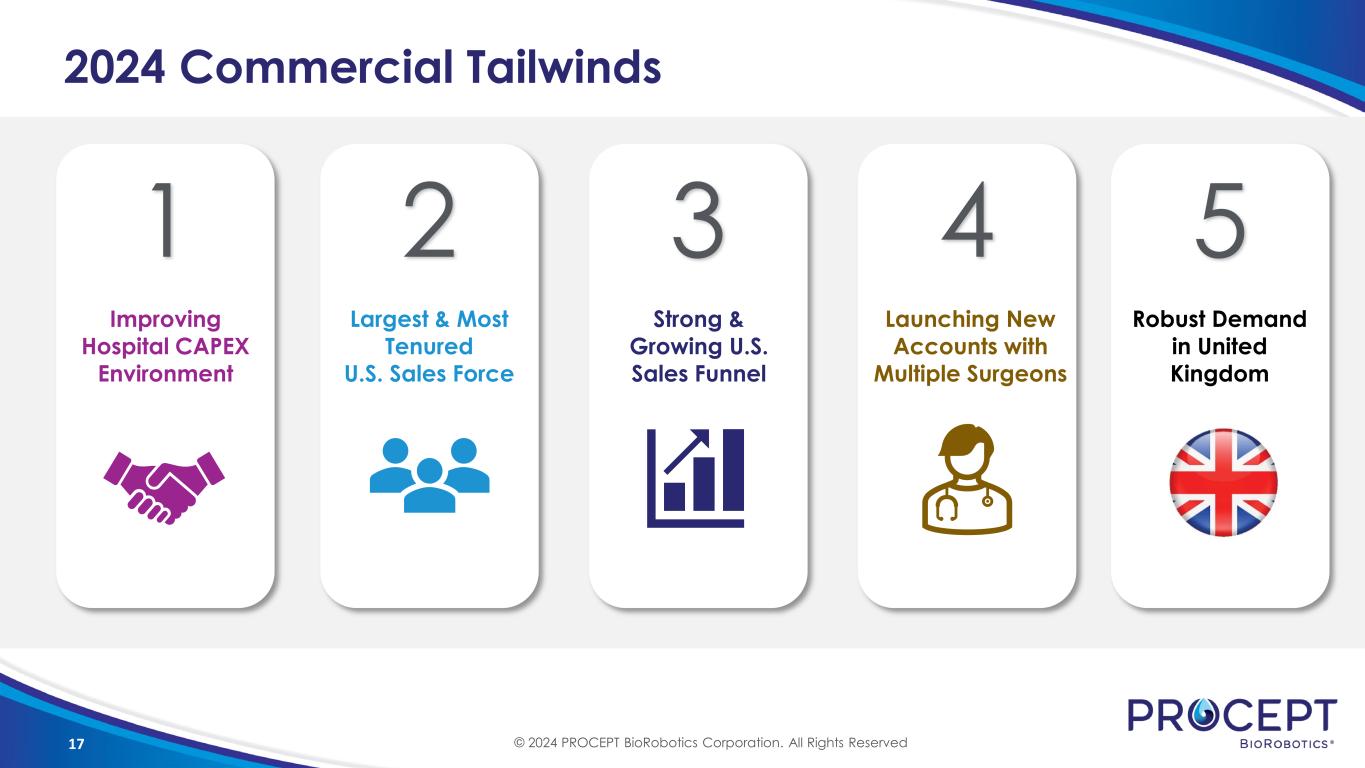 16 U.S. Capital in Position of Strength 1Q23 ~30 Sr Capital Reps ~40 ~6 months Sr Capital Rep Avg Tenure ~15 months Zero Jr Capital Reps <10 Zero Strategic Account Team 5 Deteriorating Capital Environment Stable-to-Improving No Signed Majority IDN Contracts Yes ~70% % U.S. Covered Lives >95% 1Q24 © 2024 PROCEPT BioRobotics Corporation. All Rights Reserved