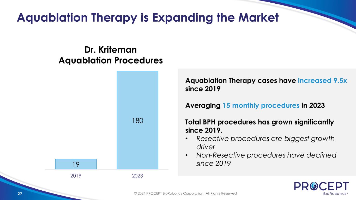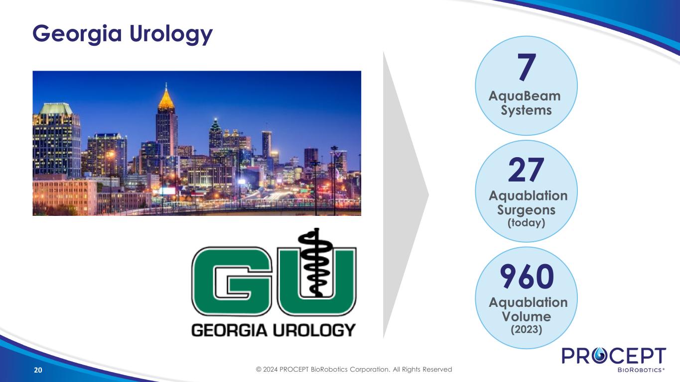 20 Georgia Urology 27 Aquablation Surgeons (today) 7 AquaBeam Systems 960 Aquablation Volume (2023) © 2024 PROCEPT BioRobotics Corporation. All Rights Reserved