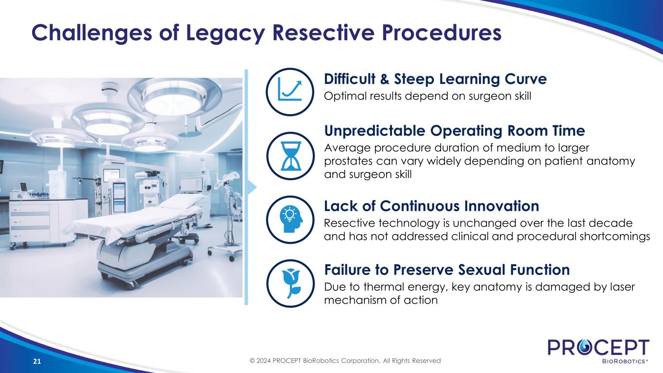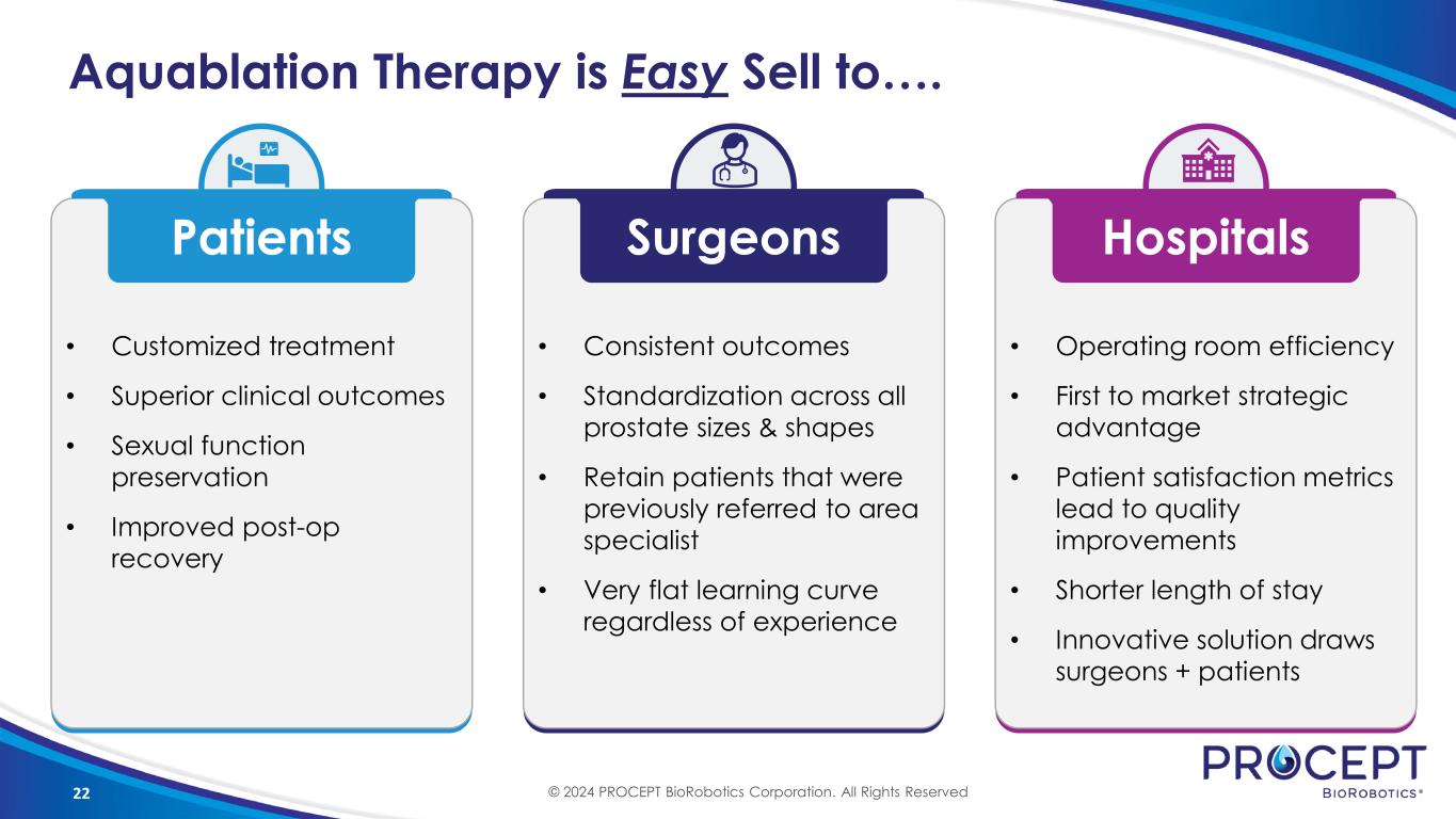 21 Challenges of Legacy Resective Procedures Optimal results depend on surgeon skill Difficult & Steep Learning Curve Average procedure duration of medium to larger prostates can vary widely depending on patient anatomy and surgeon skill Unpredictable Operating Room Time Resective technology is unchanged over the last decade and has not addressed clinical and procedural shortcomings Lack of Continuous Innovation Due to thermal energy, key anatomy is damaged by laser mechanism of action Failure to Preserve Sexual Function © 2024 PROCEPT BioRobotics Corporation. All Rights Reserved