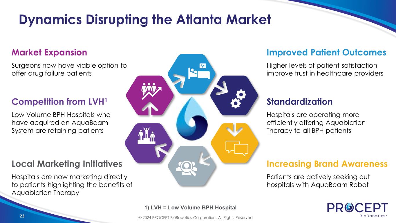 22 Aquablation Therapy is Easy Sell to…. Patients Surgeons Hospitals • Customized treatment • Superior clinical outcomes • Sexual function preservation • Improved post-op recovery • Consistent outcomes • Standardization across all prostate sizes & shapes • Retain patients that were previously referred to area specialist • Very flat learning curve regardless of experience • Operating room efficiency • First to market strategic advantage • Patient satisfaction metrics lead to quality improvements • Shorter length of stay • Innovative solution draws surgeons + patients © 2024 PROCEPT BioRobotics Corporation. All Rights Reserved