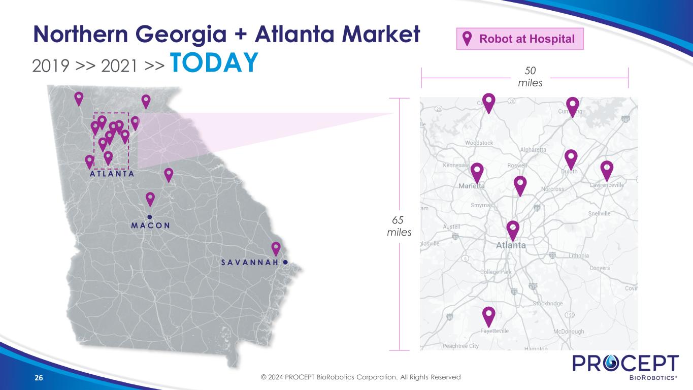 25 A T L A N T A M A C O N S A V A N N A H Northern Georgia + Atlanta Market 2019 >> 2021 50 miles 65 miles © 2024 PROCEPT BioRobotics Corporation. All Rights Reserved Robot at Hospital