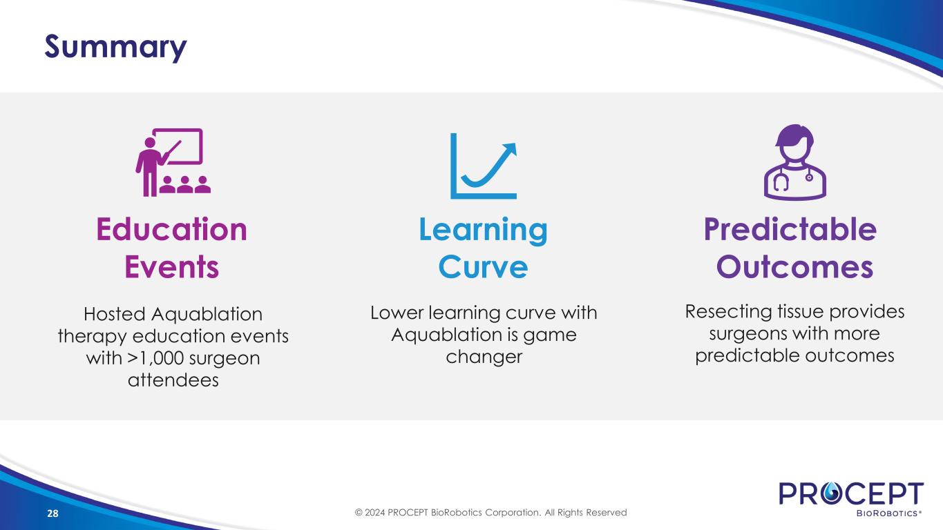 27 Aquablation Therapy is Expanding the Market 19 180 2019 2023 Aquablation Therapy cases have increased 9.5x since 2019 Averaging 15 monthly procedures in 2023 Total BPH procedures has grown significantly since 2019. • Resective procedures are biggest growth driver • Non-Resective procedures have declined since 2019 Dr. Kriteman Aquablation Procedures © 2024 PROCEPT BioRobotics Corporation. All Rights Reserved