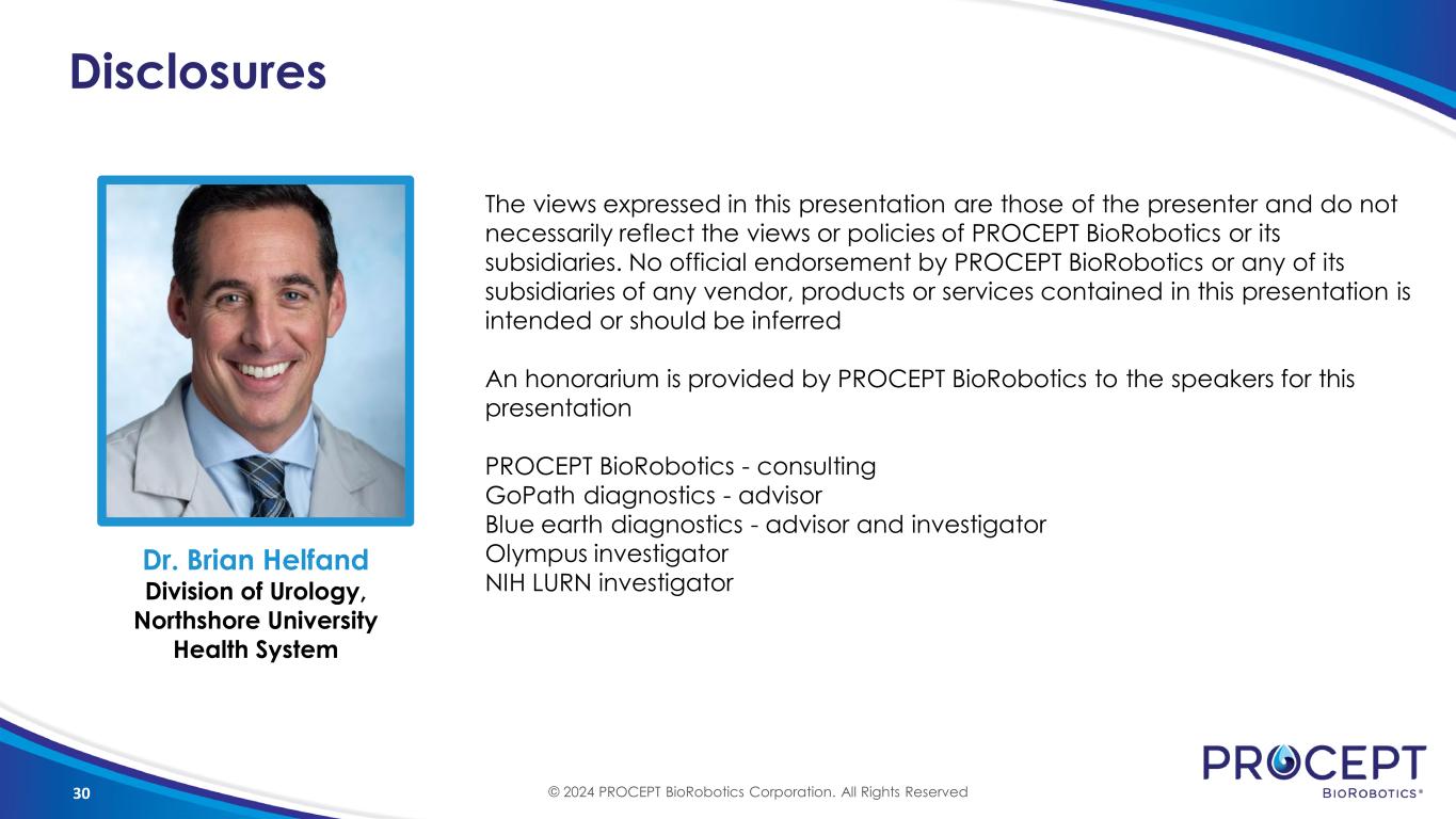 30 Disclosures The views expressed in this presentation are those of the presenter and do not necessarily reflect the views or policies of PROCEPT BioRobotics or its subsidiaries. No official endorsement by PROCEPT BioRobotics or any of its subsidiaries of any vendor, products or services contained in this presentation is intended or should be inferred An honorarium is provided by PROCEPT BioRobotics to the speakers for this presentation PROCEPT BioRobotics - consulting GoPath diagnostics - advisor Blue earth diagnostics - advisor and investigator Olympus investigator NIH LURN investigator Dr. Brian Helfand Division of Urology, Northshore University Health System © 2024 PROCEPT BioRobotics Corporation. All Rights Reserved
