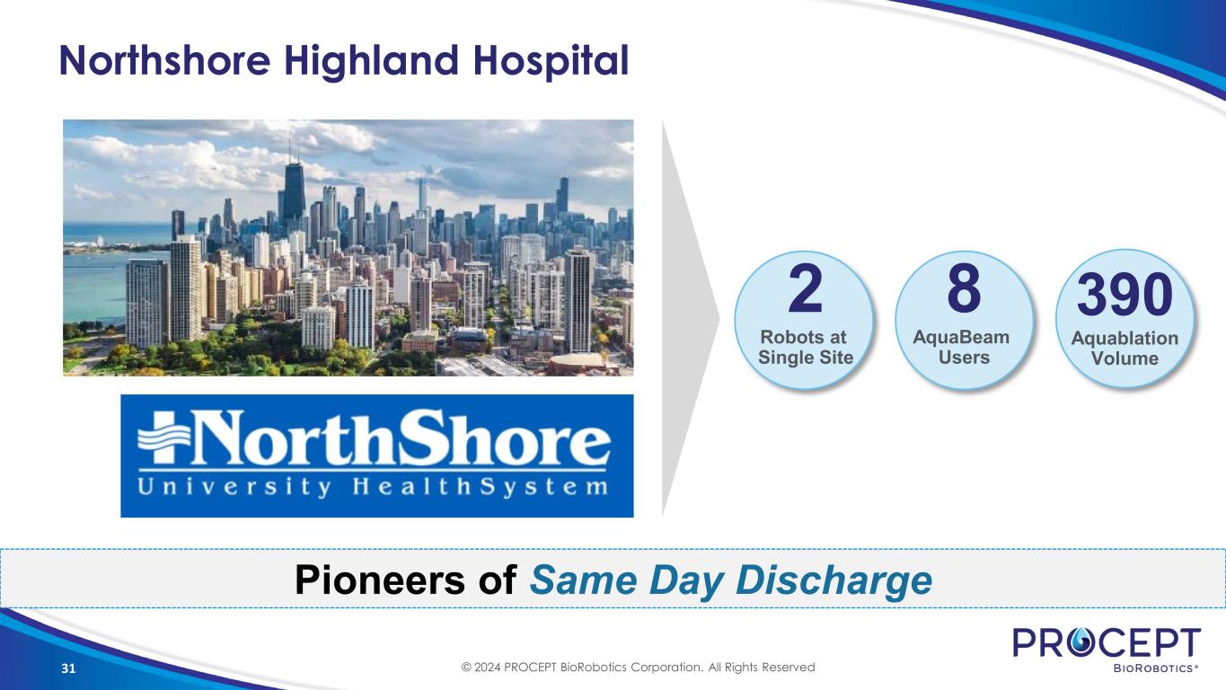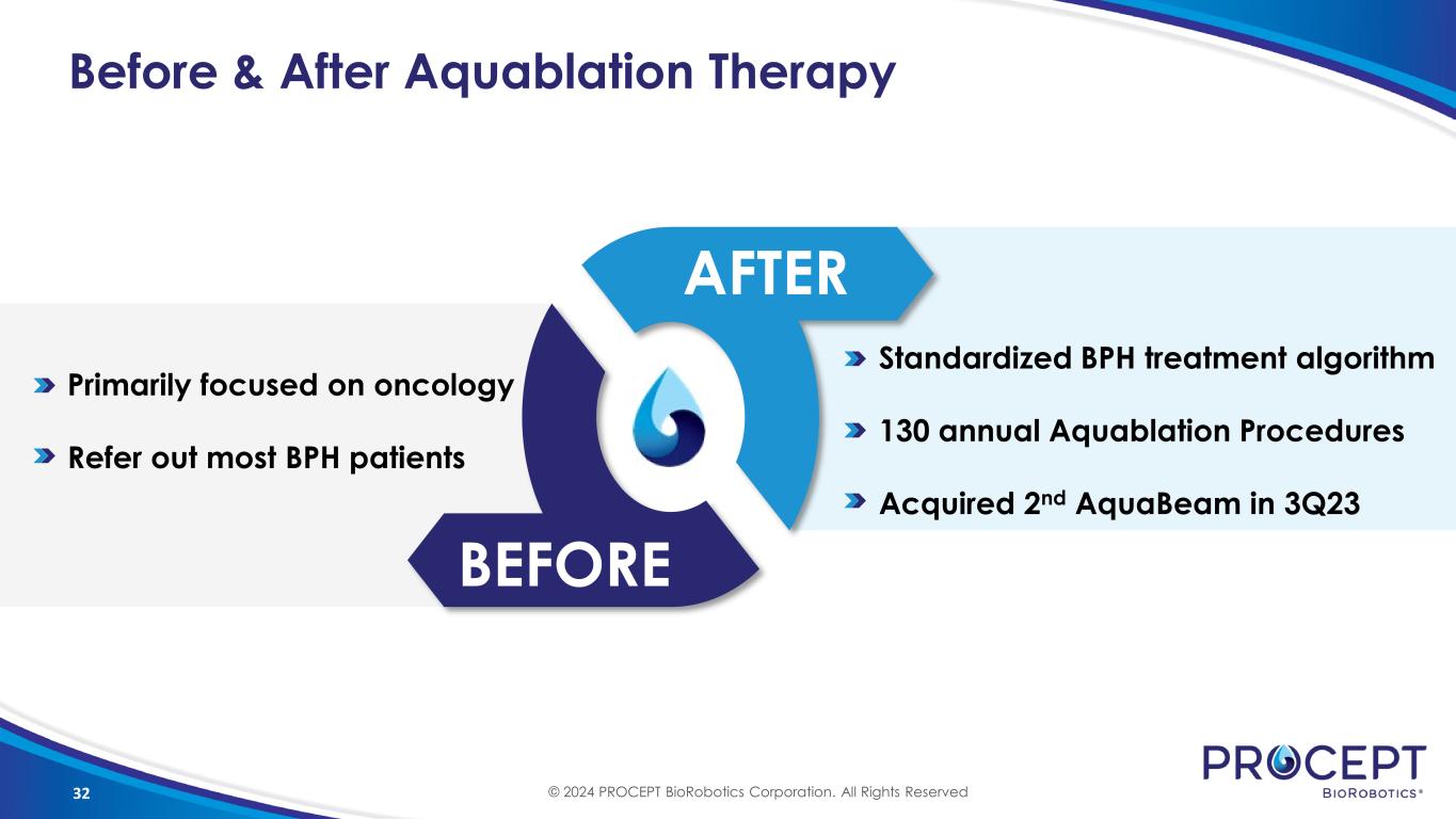 31 Northshore Highland Hospital 8 AquaBeam Users 390 Aquablation Volume Pioneers of Same Day Discharge 2 Robots at Single Site © 2024 PROCEPT BioRobotics Corporation. All Rights Reserved