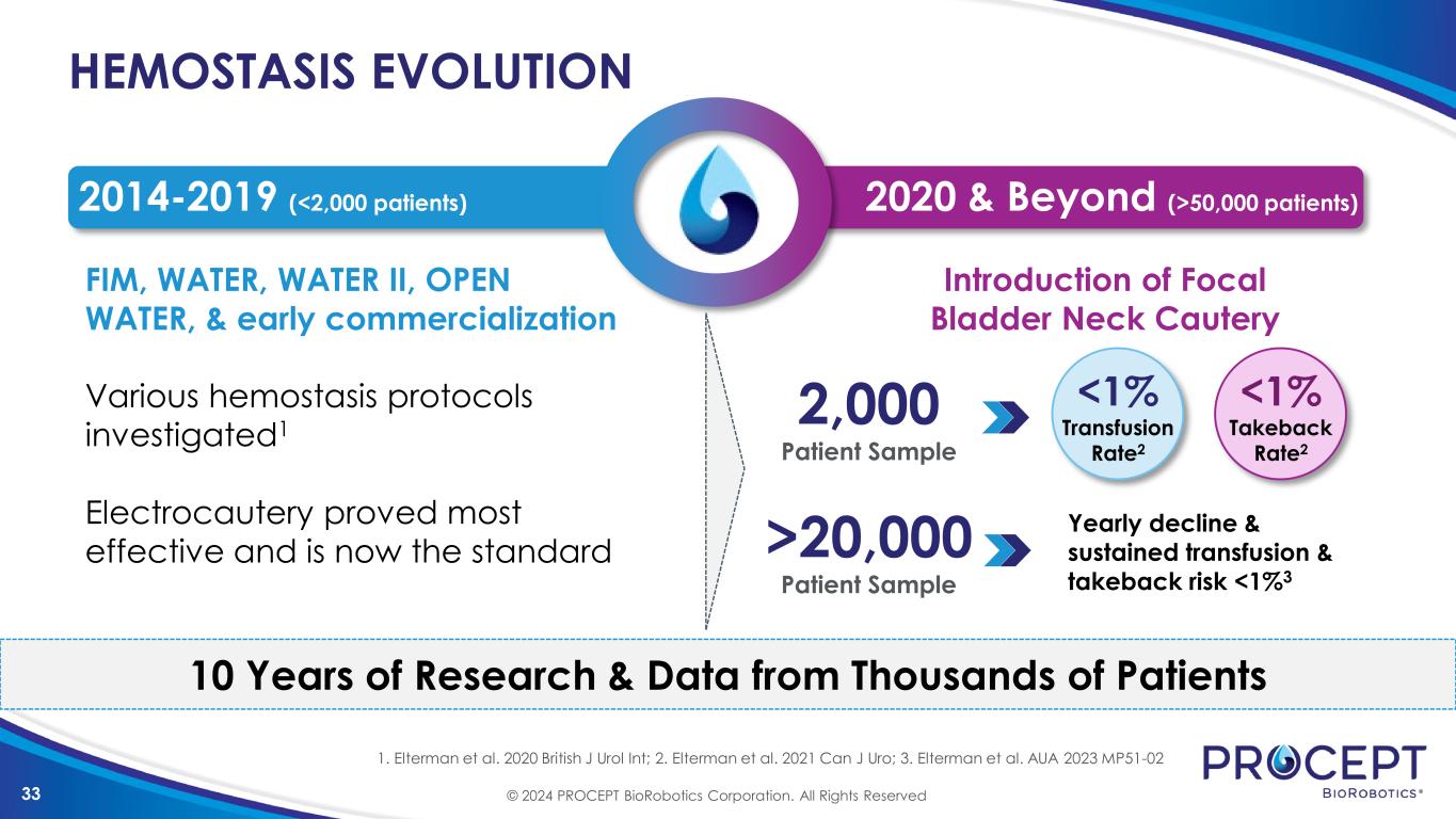 32 Before & After Aquablation Therapy BEFORE AFTER Primarily focused on oncology Refer out most BPH patients Standardized BPH treatment algorithm 130 annual Aquablation Procedures Acquired 2nd AquaBeam in 3Q23 © 2024 PROCEPT BioRobotics Corporation. All Rights Reserved