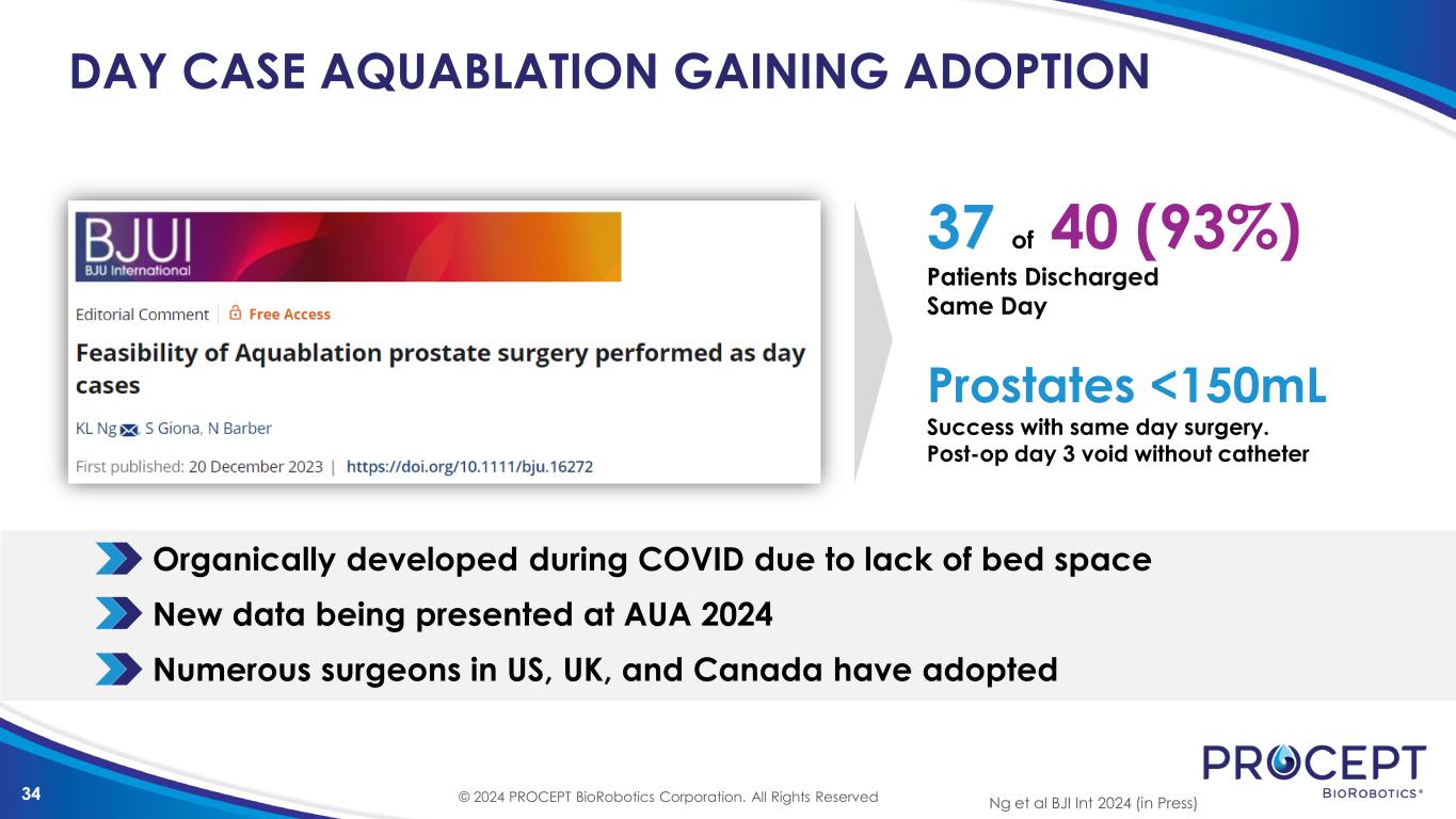 33 HEMOSTASIS EVOLUTION 2014-2019 (<2,000 patients) 2020 & Beyond (>50,000 patients) Introduction of Focal Bladder Neck Cautery FIM, WATER, WATER II, OPEN WATER, & early commercialization Various hemostasis protocols investigated1 Electrocautery proved most effective and is now the standard 10 Years of Research & Data from Thousands of Patients 1. Elterman et al. 2020 British J Urol Int; 2. Elterman et al. 2021 Can J Uro; 3. Elterman et al. AUA 2023 MP51-02 2,000 Patient Sample >20,000 Patient Sample Yearly decline & sustained transfusion & takeback risk <1%3 <1% Transfusion Rate2 <1% Takeback Rate2 © 2024 PROCEPT BioRobotics Corporation. All Rights Reserved