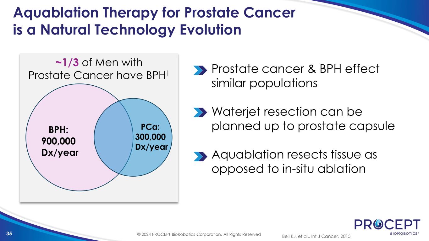 34 DAY CASE AQUABLATION GAINING ADOPTION 37 of 40 (93%) Patients Discharged Same Day Prostates <150mL Success with same day surgery. Post-op day 3 void without catheter Organically developed during COVID due to lack of bed space New data being presented at AUA 2024 Numerous surgeons in US, UK, and Canada have adopted Ng et al BJI Int 2024 (in Press)© 2024 PROCEPT BioRobotics Corporation. All Rights Reserved