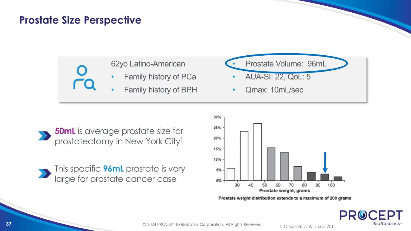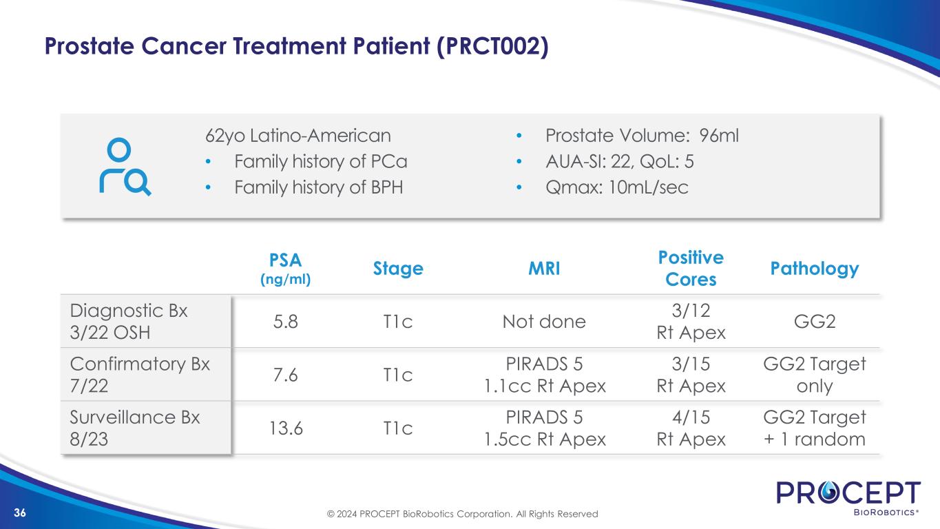 36 62yo Latino-American • Family history of PCa • Family history of BPH Prostate Cancer Treatment Patient (PRCT002) PSA (ng/ml) Stage MRI Positive Cores Pathology Diagnostic Bx 3/22 OSH 5.8 T1c Not done 3/12 Rt Apex GG2 Confirmatory Bx 7/22 7.6 T1c PIRADS 5 1.1cc Rt Apex 3/15 Rt Apex GG2 Target only Surveillance Bx 8/23 13.6 T1c PIRADS 5 1.5cc Rt Apex 4/15 Rt Apex GG2 Target + 1 random • Prostate Volume: 96ml • AUA-SI: 22, QoL: 5 • Qmax: 10mL/sec © 2024 PROCEPT BioRobotics Corporation. All Rights Reserved