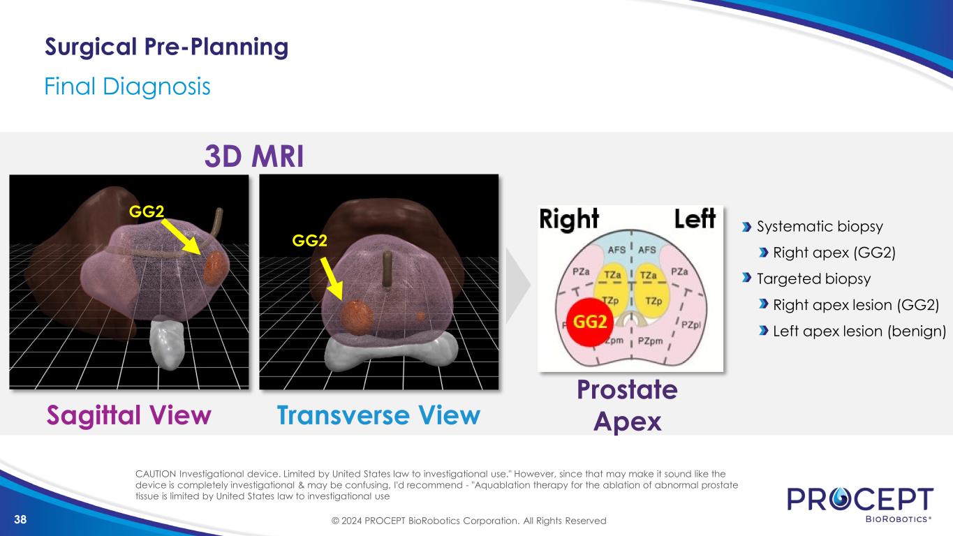 38 Surgical Pre-Planning Final Diagnosis GG2 GG2 Sagittal View 3D MRI Transverse View Systematic biopsy Right apex (GG2) Targeted biopsy Right apex lesion (GG2) Left apex lesion (benign) Prostate Apex © 2024 PROCEPT BioRobotics Corporation. All Rights Reserved CAUTION Investigational device. Limited by United States law to investigational use." However, since that may make it sound like the device is completely investigational & may be confusing, I'd recommend - "Aquablation therapy for the ablation of abnormal prostate tissue is limited by United States law to investigational use