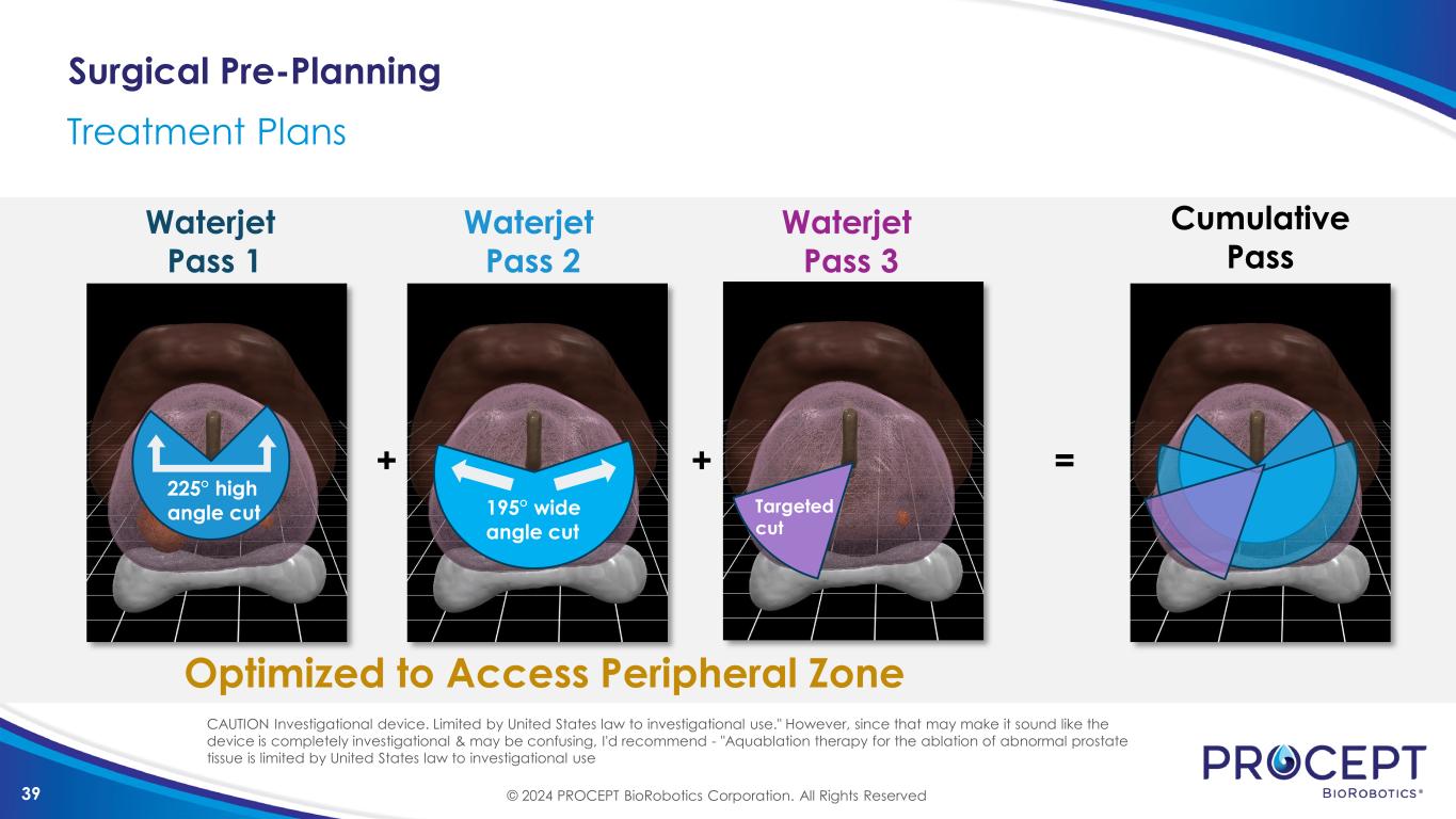 39 Surgical Pre-Planning Treatment Plans + + = Waterjet Pass 1 Waterjet Pass 2 Waterjet Pass 3 Cumulative Pass 225° high angle cut 195° wide angle cut Targeted cut Optimized to Access Peripheral Zone © 2024 PROCEPT BioRobotics Corporation. All Rights Reserved CAUTION Investigational device. Limited by United States law to investigational use." However, since that may make it sound like the device is completely investigational & may be confusing, I'd recommend - "Aquablation therapy for the ablation of abnormal prostate tissue is limited by United States law to investigational use