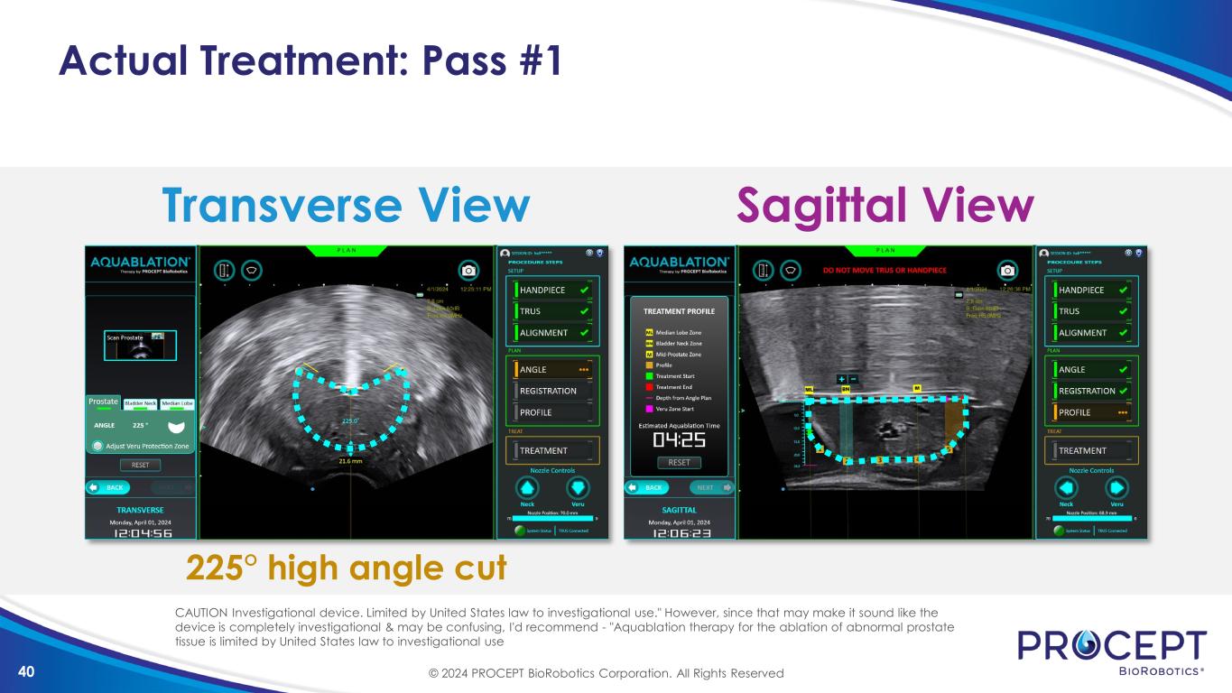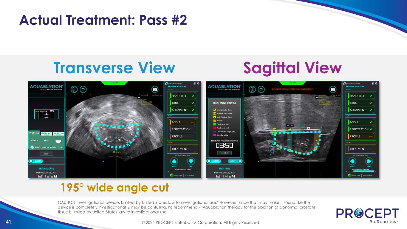 40 Actual Treatment: Pass #1 Transverse View Sagittal View 225° high angle cut © 2024 PROCEPT BioRobotics Corporation. All Rights Reserved CAUTION Investigational device. Limited by United States law to investigational use." However, since that may make it sound like the device is completely investigational & may be confusing, I'd recommend - "Aquablation therapy for the ablation of abnormal prostate tissue is limited by United States law to investigational use