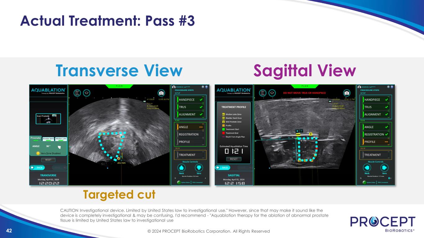 41 Actual Treatment: Pass #2 Transverse View Sagittal View 195° wide angle cut © 2024 PROCEPT BioRobotics Corporation. All Rights Reserved CAUTION Investigational device. Limited by United States law to investigational use." However, since that may make it sound like the device is completely investigational & may be confusing, I'd recommend - "Aquablation therapy for the ablation of abnormal prostate tissue is limited by United States law to investigational use