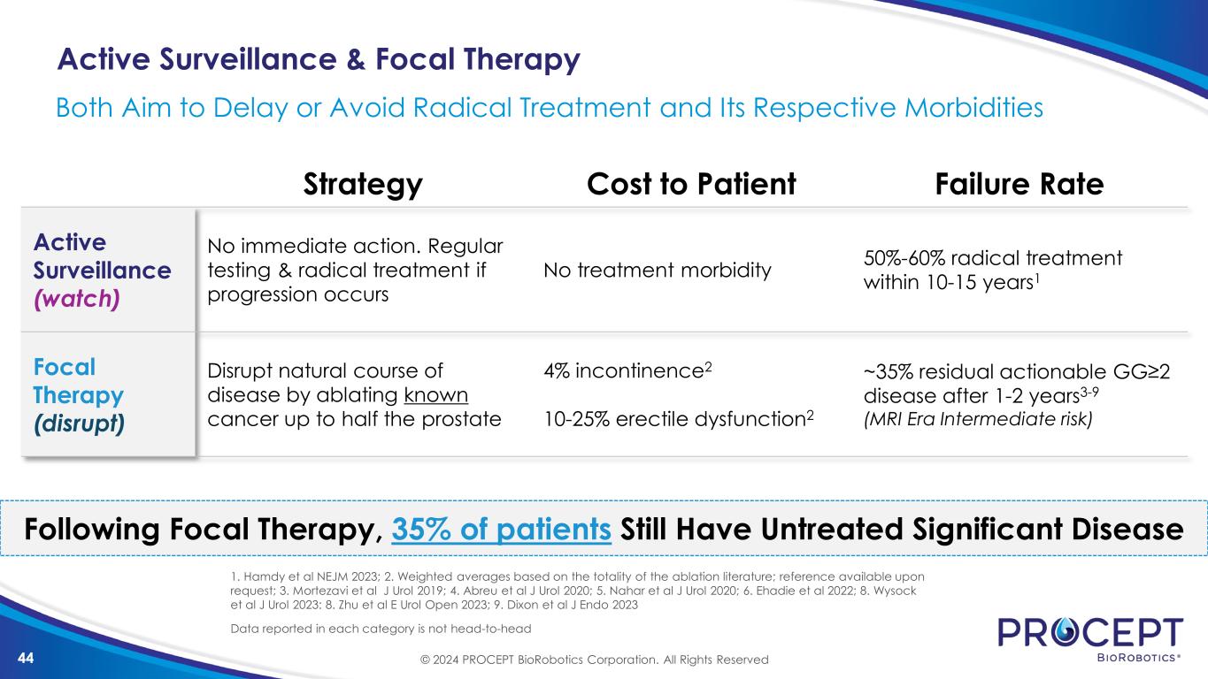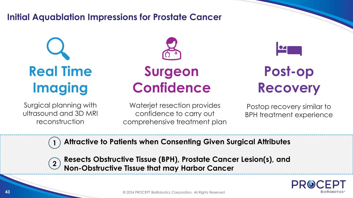 43 Initial Aquablation Impressions for Prostate Cancer Real Time Imaging Surgical planning with ultrasound and 3D MRI reconstruction Surgeon Confidence Waterjet resection provides confidence to carry out comprehensive treatment plan Post-op Recovery Postop recovery similar to BPH treatment experience Attractive to Patients when Consenting Given Surgical Attributes Resects Obstructive Tissue (BPH), Prostate Cancer Lesion(s), and Non-Obstructive Tissue that may Harbor Cancer 1 2 © 2024 PROCEPT BioRobotics Corporation. All Rights Reserved