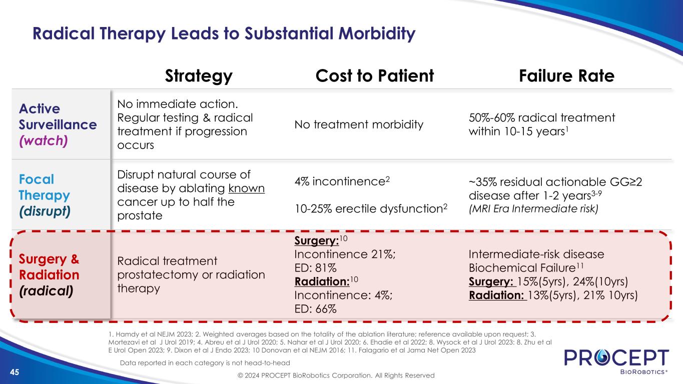 44 Active Surveillance & Focal Therapy Both Aim to Delay or Avoid Radical Treatment and Its Respective Morbidities Strategy Cost to Patient Failure Rate Active Surveillance (watch) No immediate action. Regular testing & radical treatment if progression occurs No treatment morbidity 50%-60% radical treatment within 10-15 years1 Focal Therapy (disrupt) Disrupt natural course of disease by ablating known cancer up to half the prostate 4% incontinence2 10-25% erectile dysfunction2 ~35% residual actionable GG≥2 disease after 1-2 years3-9 (MRI Era Intermediate risk) Following Focal Therapy, 35% of patients Still Have Untreated Significant Disease 1. Hamdy et al NEJM 2023; 2. Weighted averages based on the totality of the ablation literature; reference available upon request; 3. Mortezavi et al J Urol 2019; 4. Abreu et al J Urol 2020; 5. Nahar et al J Urol 2020; 6. Ehadie et al 2022; 8. Wysock et al J Urol 2023: 8. Zhu et al E Urol Open 2023; 9. Dixon et al J Endo 2023 © 2024 PROCEPT BioRobotics Corporation. All Rights Reserved Data reported in each category is not head-to-head