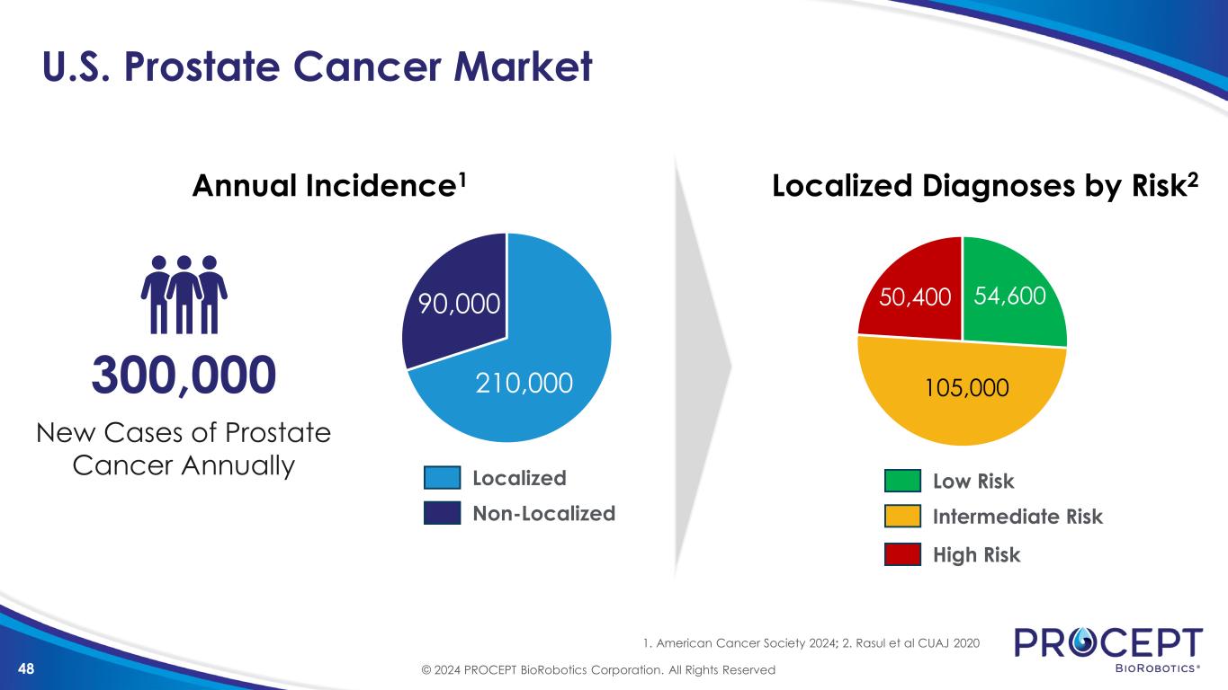 47 Prostate Cancer in U.S. 3.3 Million Men in the U.S. living with prostate cancer today1 Prostate cancer is a serious disease, but most men diagnosed do not die from it2 Low Mortality Common treatment recommendation given low disease lethality and high risk of treatment morbidity Active Surveillance 1. American Cancer Society 2024; 2. Hamdy et al NEJM 2023; Donovan et al NEJM 2016 >2 million Men Living With Low to Intermediate Risk Disease © 2024 PROCEPT BioRobotics Corporation. All Rights Reserved