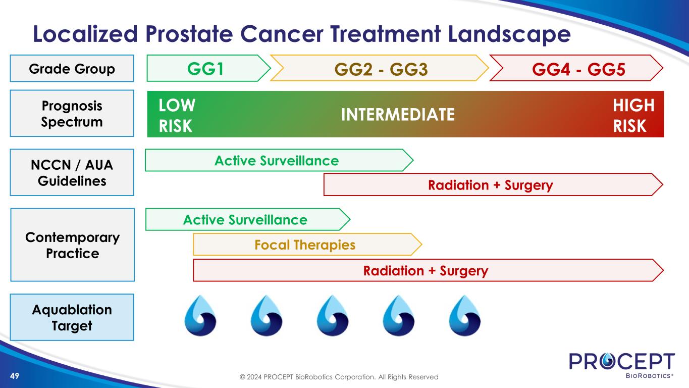 48 U.S. Prostate Cancer Market 300,000 New Cases of Prostate Cancer Annually Low Risk Intermediate Risk High Risk 210,000 90,000 54,600 105,000 50,400 Localized Diagnoses by Risk2 Localized Non-Localized Annual Incidence1 1. American Cancer Society 2024; 2. Rasul et al CUAJ 2020 © 2024 PROCEPT BioRobotics Corporation. All Rights Reserved