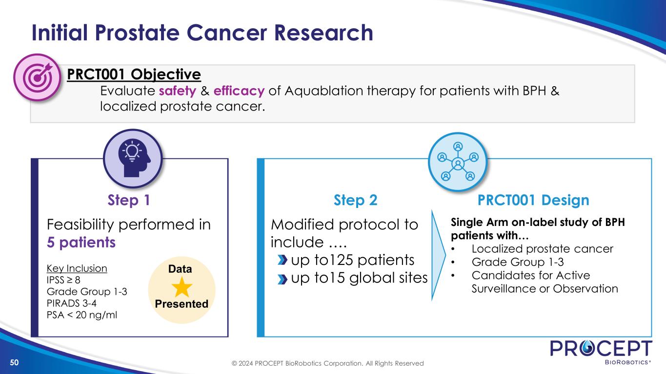 49 Localized Prostate Cancer Treatment Landscape Prognosis Spectrum LOW RISK HIGH RISKINTERMEDIATE NCCN / AUA Guidelines Aquablation Target Active Surveillance Radiation + Surgery Contemporary Practice Active Surveillance Focal Therapies Radiation + Surgery Grade Group GG1 GG2 - GG3 GG4 - GG5 © 2024 PROCEPT BioRobotics Corporation. All Rights Reserved