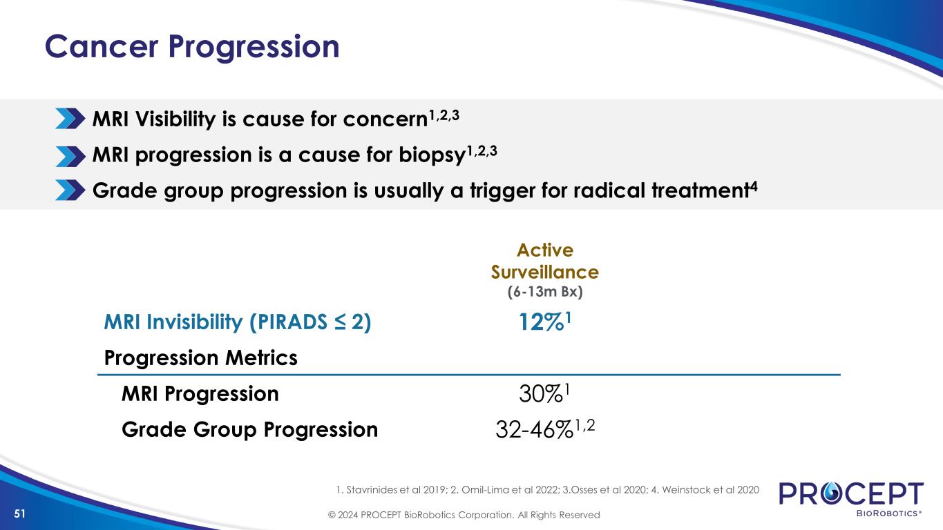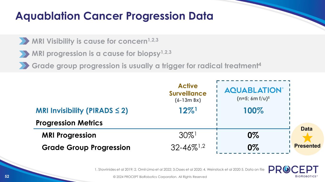 51 Cancer Progression MRI Visibility is cause for concern1,2,3 MRI progression is a cause for biopsy1,2,3 Grade group progression is usually a trigger for radical treatment4 1. Stavrinides et al 2019; 2. Omil-Lima et al 2022; 3.Osses et al 2020; 4. Weinstock et al 2020 Active Surveillance (6-13m Bx) MRI Invisibility (PIRADS ≤ 2) 12%1 Progression Metrics MRI Progression 30%1 Grade Group Progression 32-46%1,2 © 2024 PROCEPT BioRobotics Corporation. All Rights Reserved