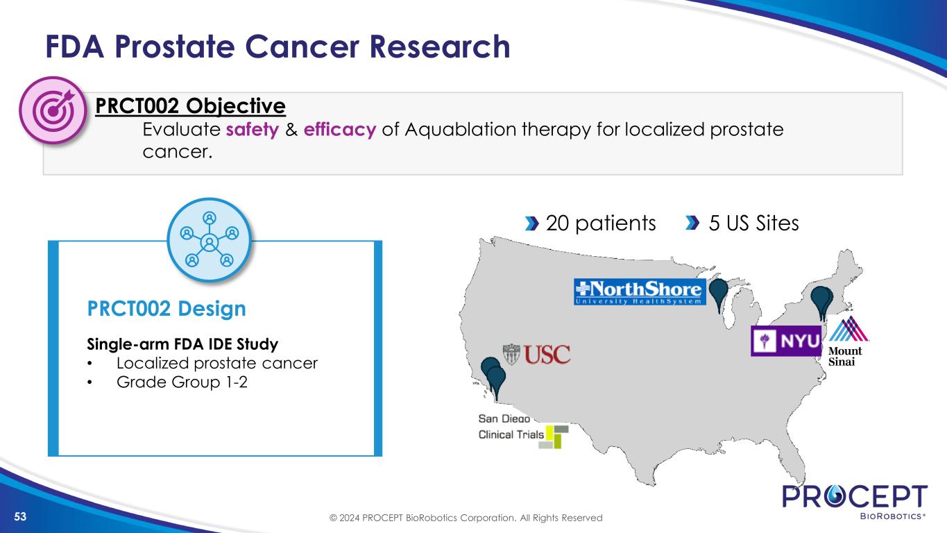 52 Aquablation Cancer Progression Data MRI Visibility is cause for concern1,2,3 MRI progression is a cause for biopsy1,2,3 Grade group progression is usually a trigger for radical treatment4 1. Stavrinides et al 2019; 2. Omil-Lima et al 2022; 3.Osses et al 2020; 4. Weinstock et al 2020 5. Data on file Active Surveillance (6-13m Bx) (n=5; 6m f/u)5 MRI Invisibility (PIRADS ≤ 2) 12%1 100% Progression Metrics MRI Progression 30%1 0% Grade Group Progression 32-46%1,2 0% © 2024 PROCEPT BioRobotics Corporation. All Rights Reserved Data Presented